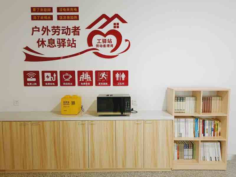 场站内全天候为快递小哥、环卫工人等户外劳动者提供服务。解决他们的“如厕难、饮水难、吃饭难、休息难”等问题,按照 “十个一”配置的要求,配备一套桌椅、一台微波炉、一台饮水机、一套冷暖设备、一个应急药箱(配备常用药)、一个工具修理箱、一组充电多孔插座、一组手机充电器、一个阅览角、一处就近卫生间,以此“向劳动者致敬”,让他们感受到公交有温度的服务。