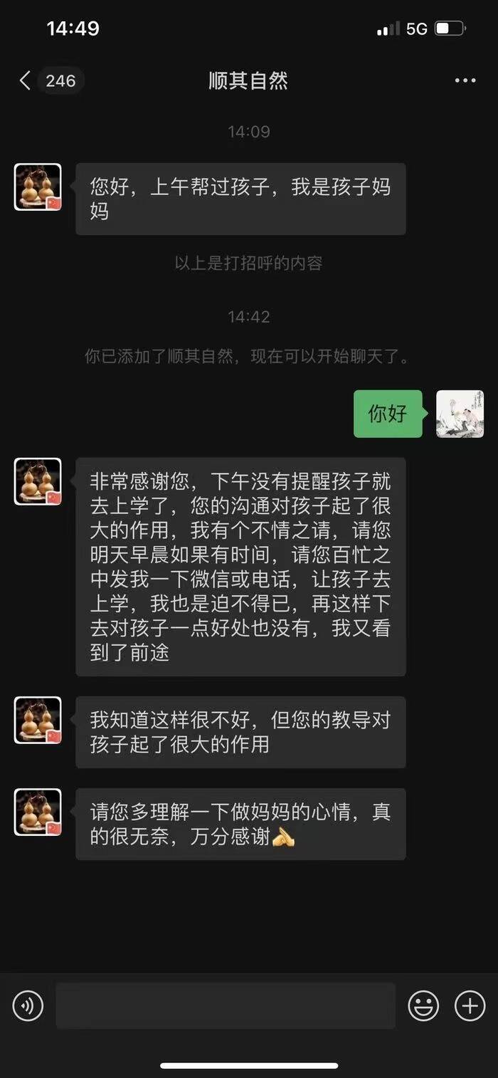 看到母子平安,陆勇才放心离开。事后,孩子的母亲张某专门加了陆勇的微信,激动地说:“非常感谢您,下午没有提醒孩子就去上学了,您的沟通对孩子起了很大的作用……”