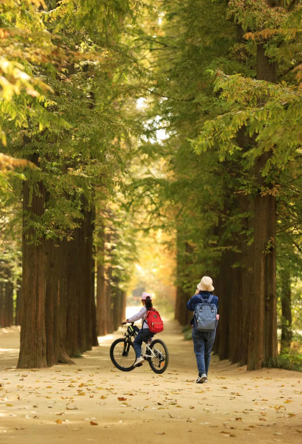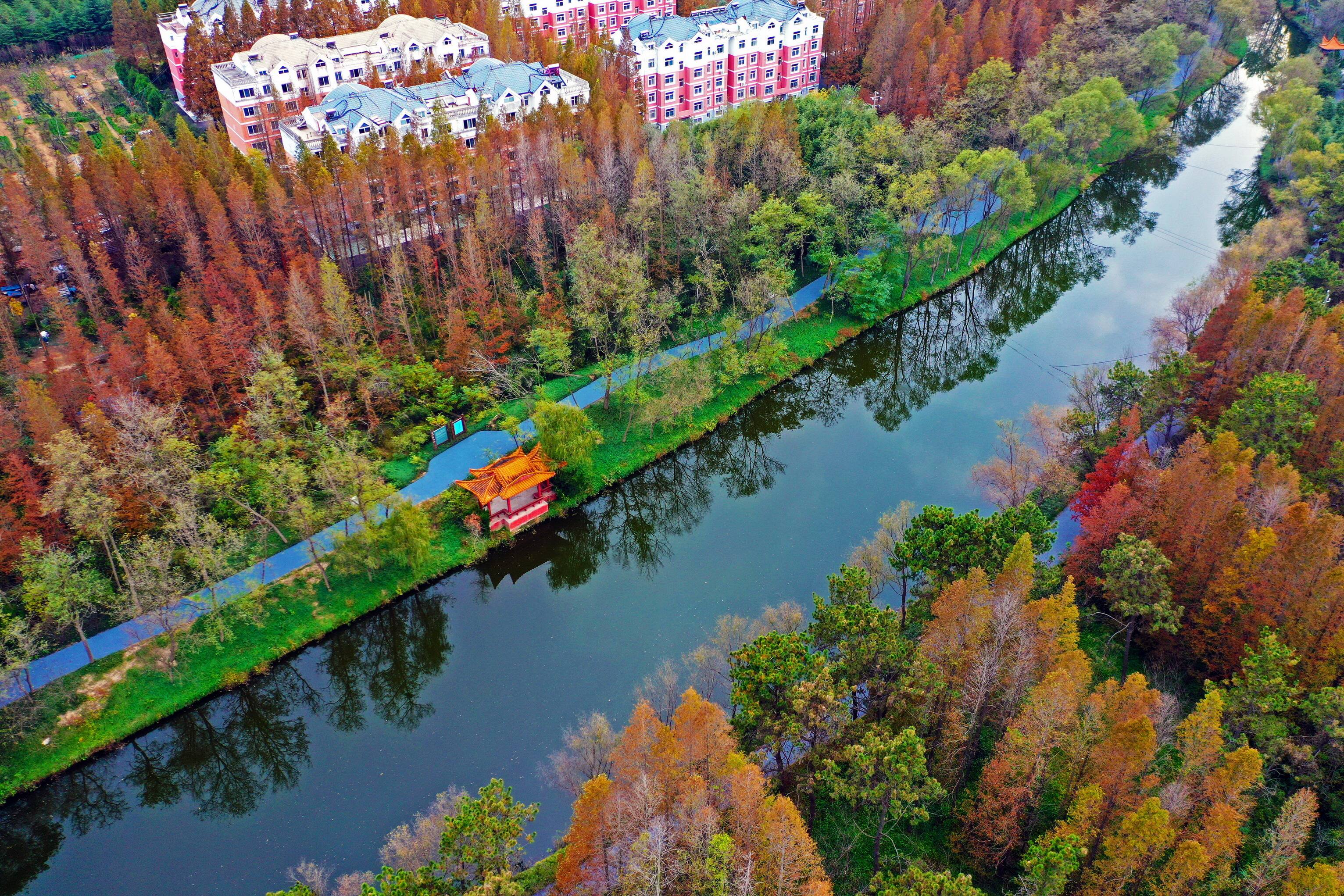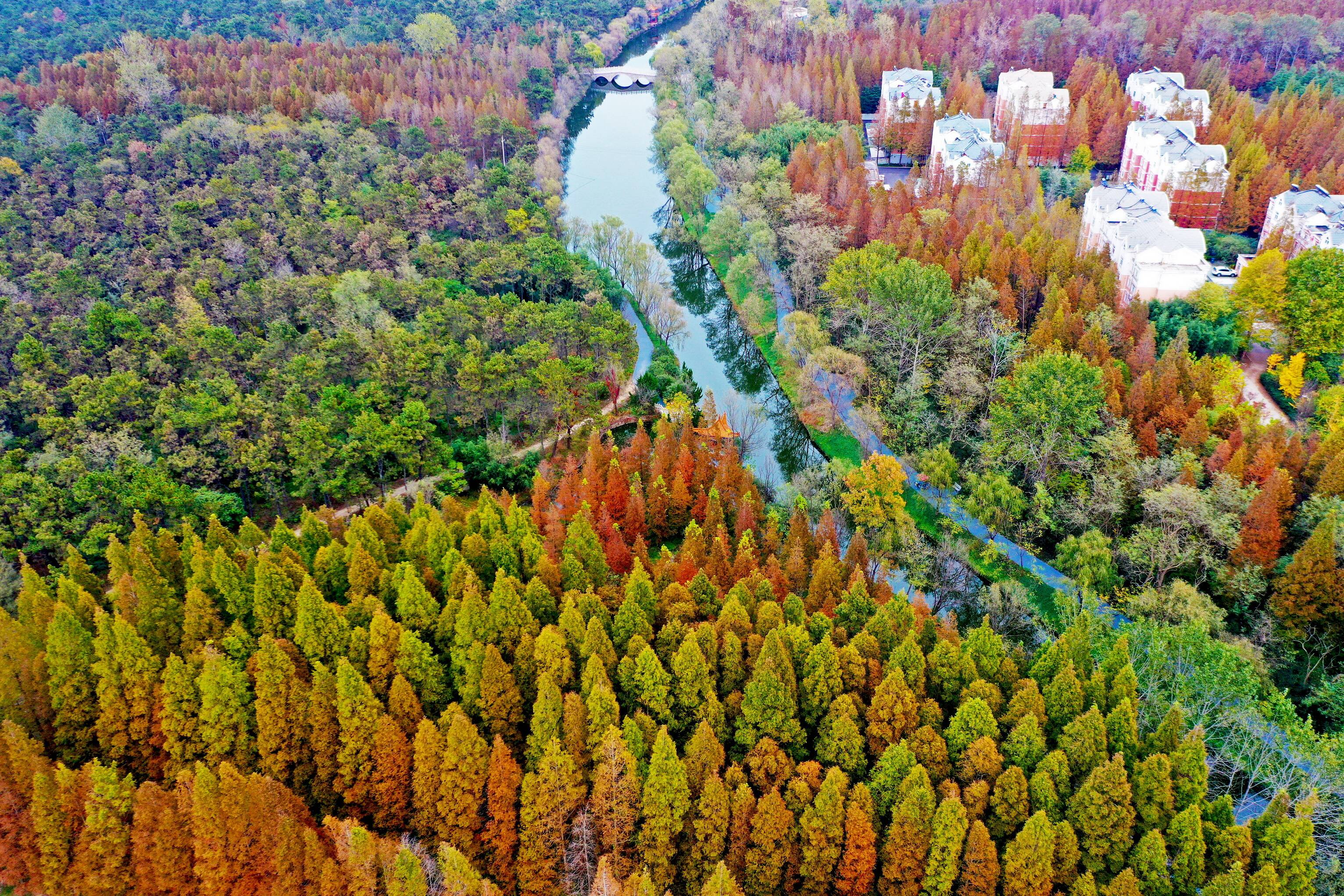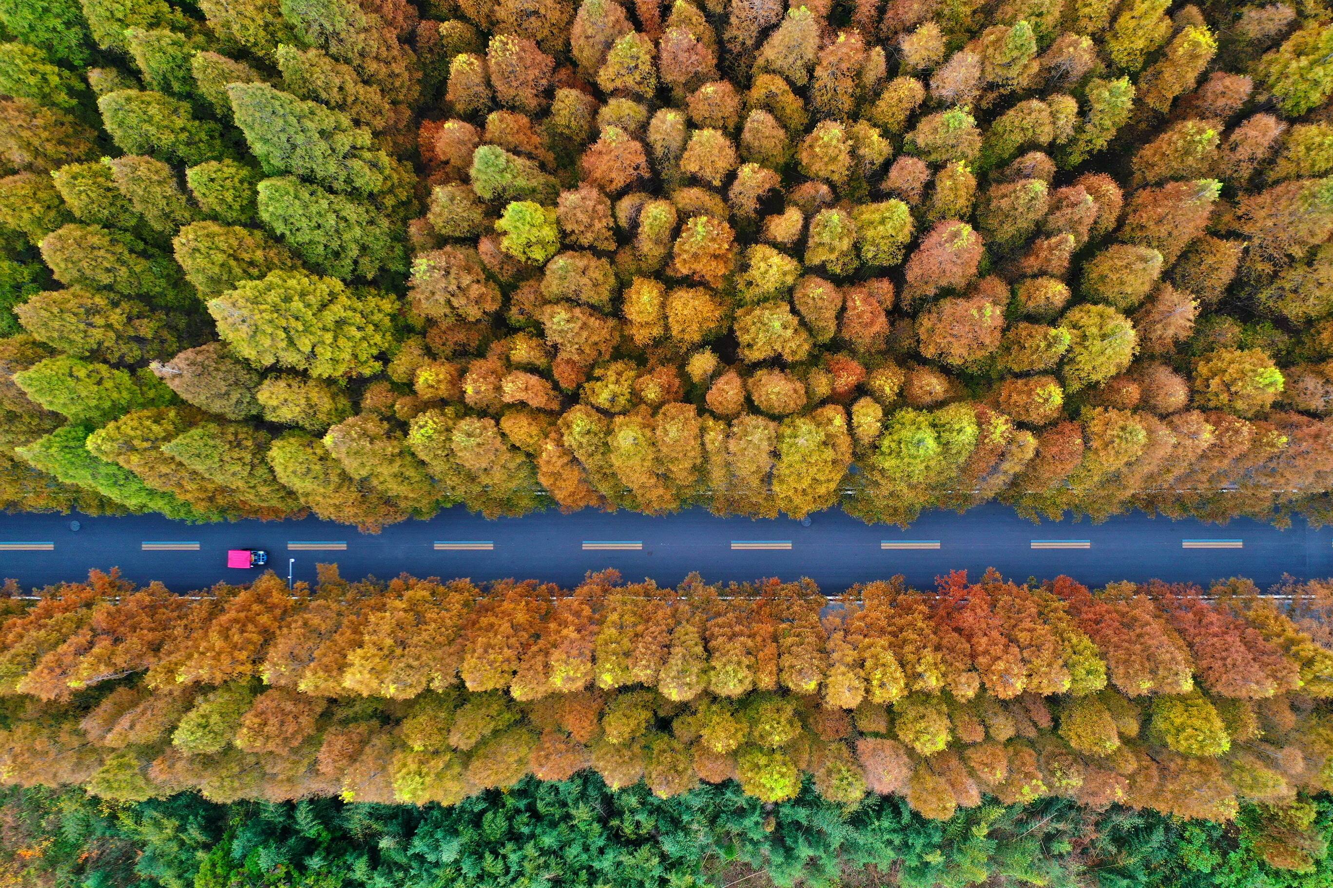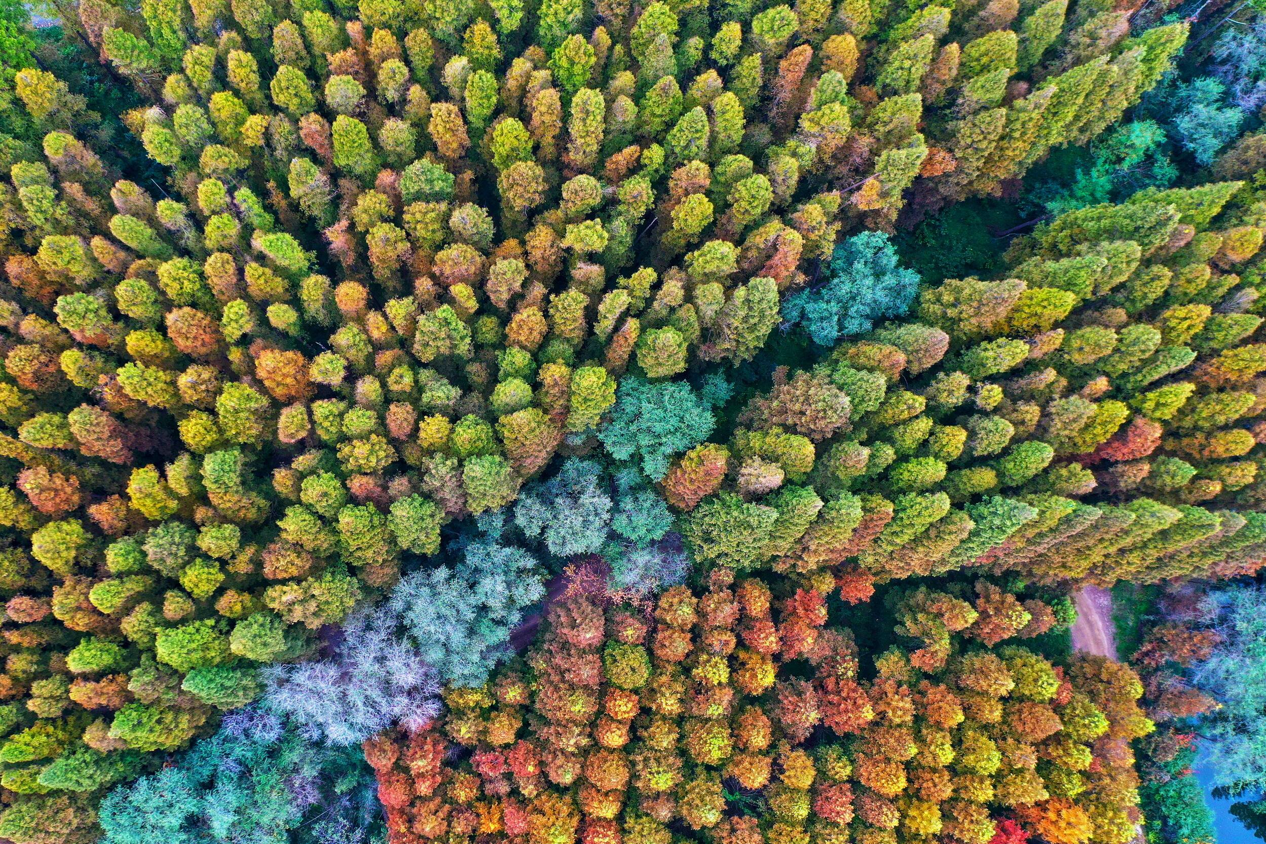 高空俯瞰,松树林仍是青绿色彩,而水杉林则已变黄变红,两种颜色“泾渭分明”。翠绿之夏,金黄之秋,秋夏景色交融,美若童话仙境。
