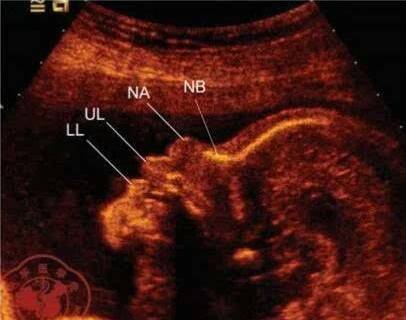 胎儿鼻骨在超声上显示为鼻梁内一条有回声的细线,检测的最佳时间为孕11~13+6周。