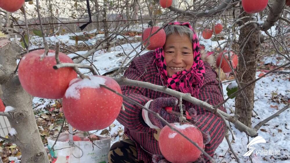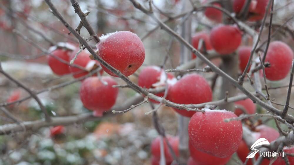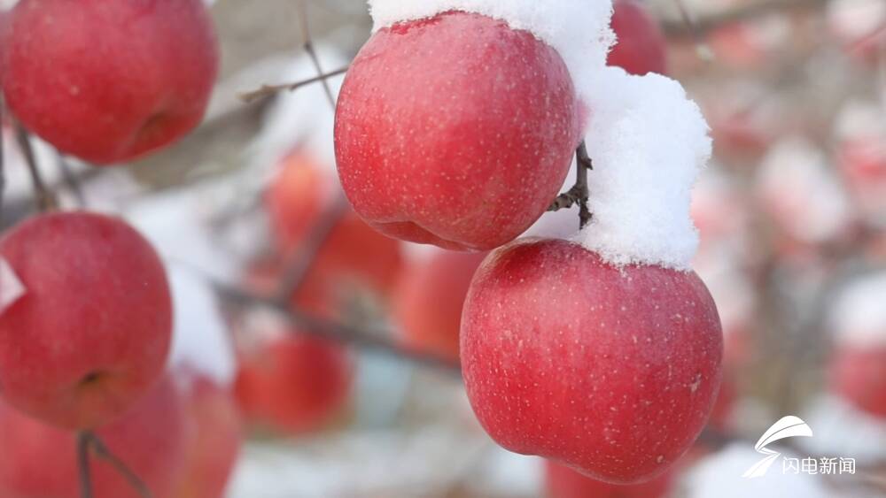 齐鲁网·闪电新闻12月8日讯 眼下正值初冬,按说果园里已经见不到鲜苹果的身影了。但是,在烟台栖霞市的一处果园里面,鲜红的苹果却挂满了枝头,果农们正在田间踏着积雪,采摘苹果。
