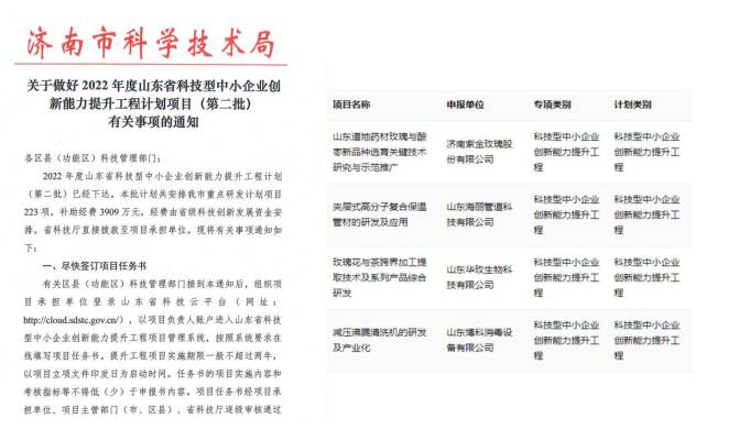 齐鲁网·闪电新闻12月9日讯 近日,济南市科学技术局下发了《关于做好2022年度山东省科技型中小企业创新能力提升工程项目(第二批)有关事项的通知》,其中公布了最新一批山东省科技型中小企业创新能力提升工程立项名单,我县紫金玫瑰、海丽管道、华玫生物、博科消毒4家企业的申报项目名列其中。