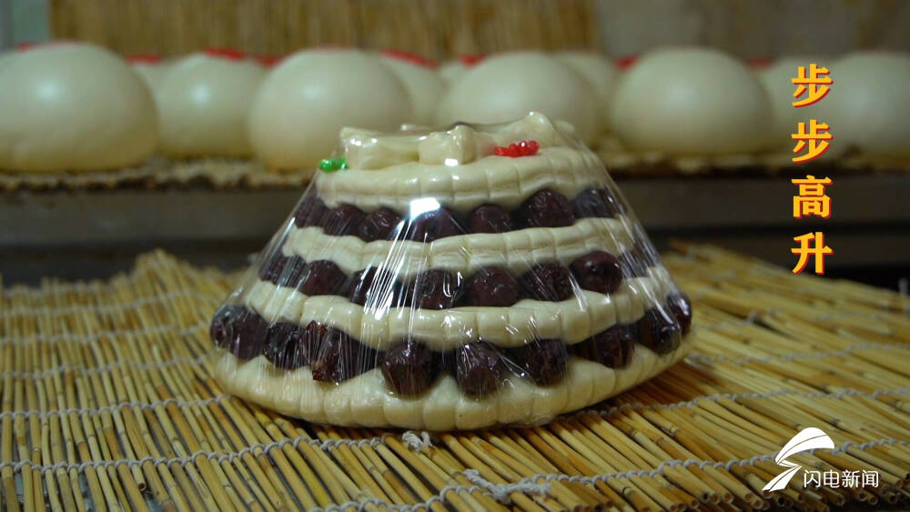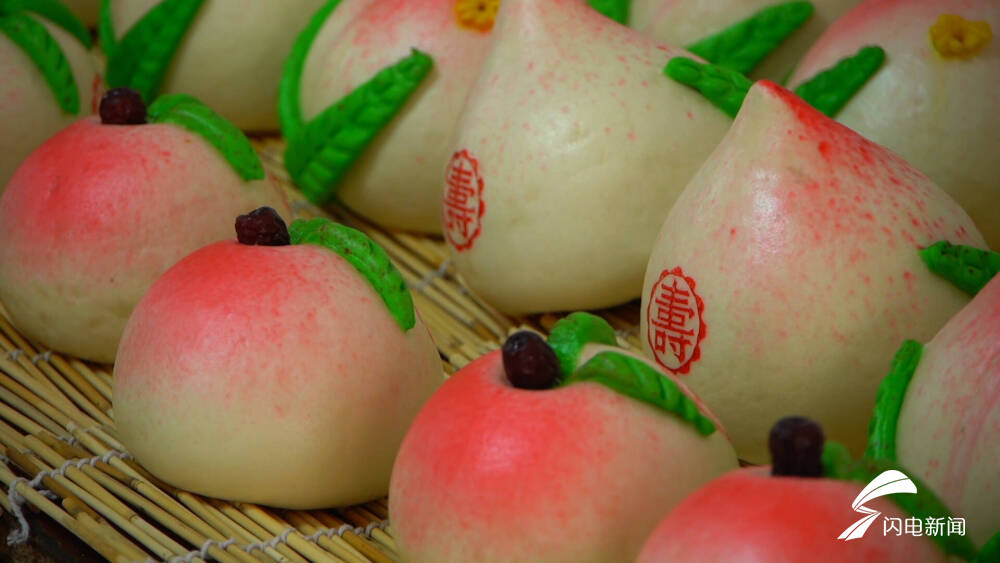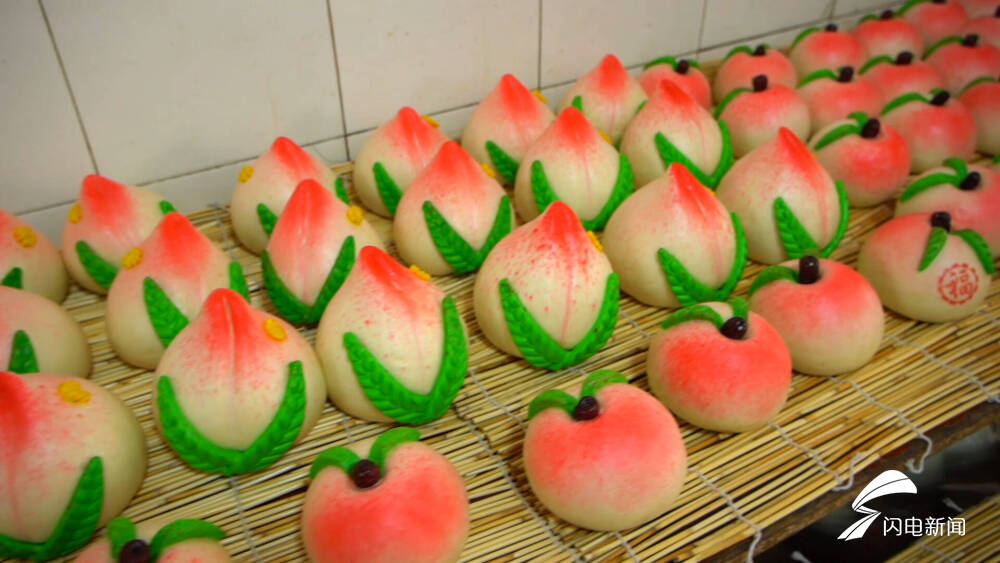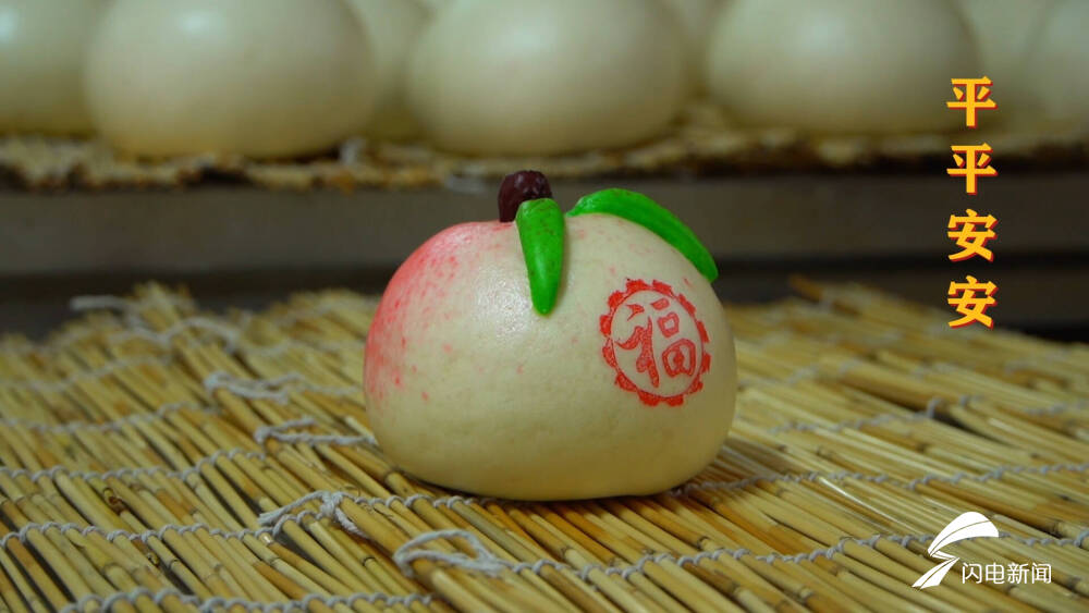 好面好手艺,才能出好馍,这些花馍采用纯手工制作,需要经过揉面、雕花、蒸烤、自然摊晾等多道工序,揉挤使其韧,捶敲使其实,晾晒成其型。其中难度最大的花馍当属小寿桃和苹果,叶片颜色和纹理的塑造力求精细,这两种花馍要耗费一两个小时,经过5名工人合力操作才能完成。