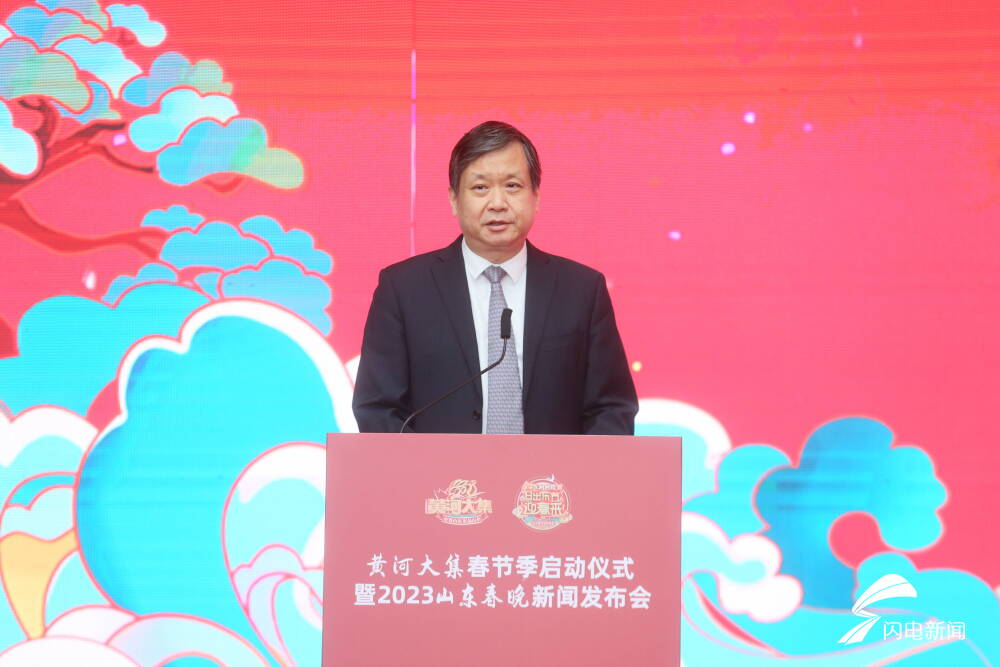 山东省委宣传部副部长、省电影局局长程守田在致辞中表示,山东作为黄河流域九省区唯一的东部沿海大省,文化旅游资源富集,山东在传承弘扬黄河文化上优势突出、责任重大。省委宣传部会同13个部门单位,共同策划举办“黄河大集”,通过“线下大集+线上带货+宣传推介”的方式,打造融黄河九省(区)文化、旅游、好品为一体,共同讲好黄河故事的文旅消费品牌,是传承黄河优秀文化、助力乡村全面振兴、满足群众美好生活需要的重要举措。连日来,各地各部门以“黄河大集”为载体,结合文化、科技、卫生、法律“四下乡”组织实施各类惠民利民项目,展示各具特色的民俗活动,为农民群众办好事、让文化服务到基层、促城乡好品进市场、带城里人赶大集迅速火爆全网,“黄河大集”传播力和影响力迅速提升,为全省人民营造出欢乐、祥和、喜庆的中国年味。2023年山东春晚舞美设计精美、演员阵容强大,节目质量一流,共同传递“家的味道”、致敬平凡英雄、展现“山东骄傲”。相信“黄河大集”春节季和2023山东春晚,一定能为山东人民乃至全国人民献上一份春节文化大餐。