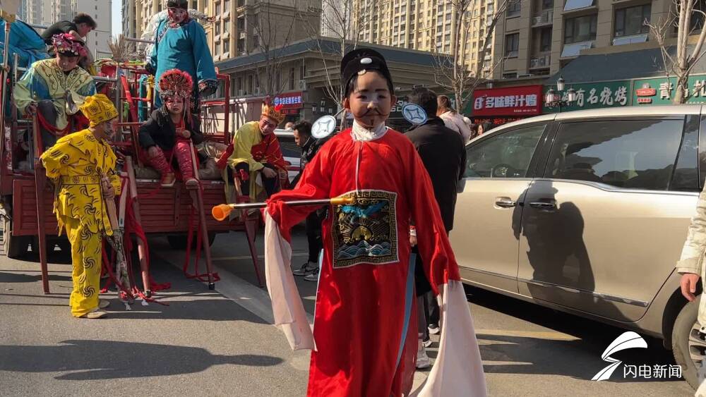 “每年正月初一到十五都是我们最忙碌的时候,一场接着一场,几乎每天都要表演7到8场。我们是济南本土的高跷,有高腿子、矮腿子之分,高腿子是文腿子,矮腿子是武腿子。我们表演的剧目除了《打渔杀家》《傻小子扑蝴蝶》《王二赶脚》等传统剧目之外,还增加了高跷跳板、高跷翻跟头等高跷杂技,融入了一些高难度的动作,给市民带来不同的表演。”小超高跷队班主王超高速闪电新闻记者。