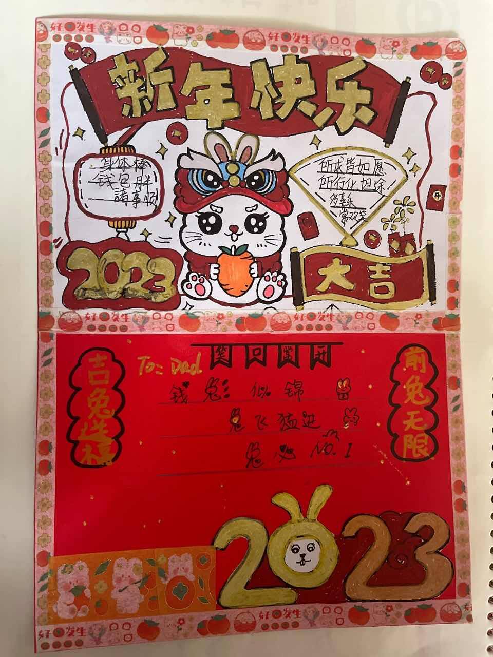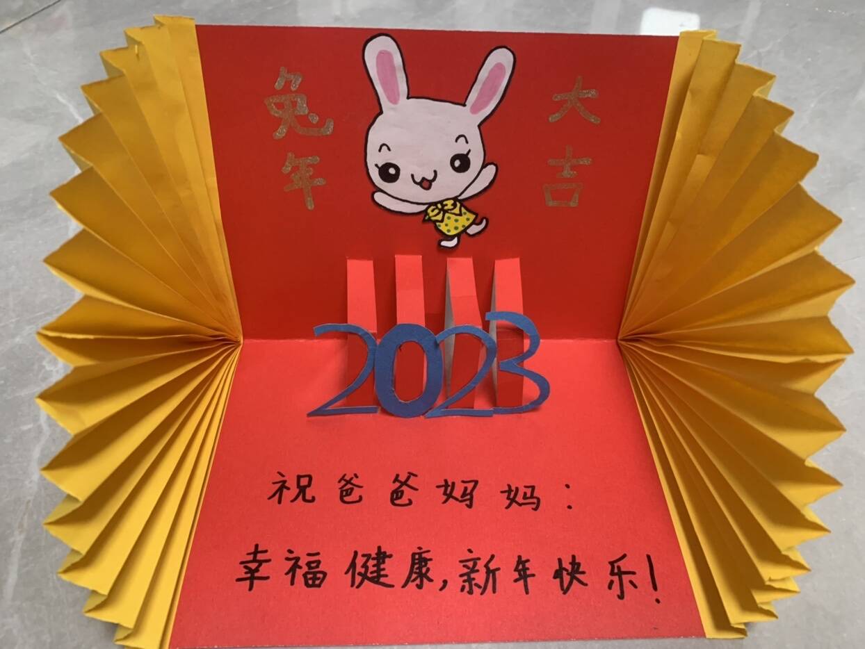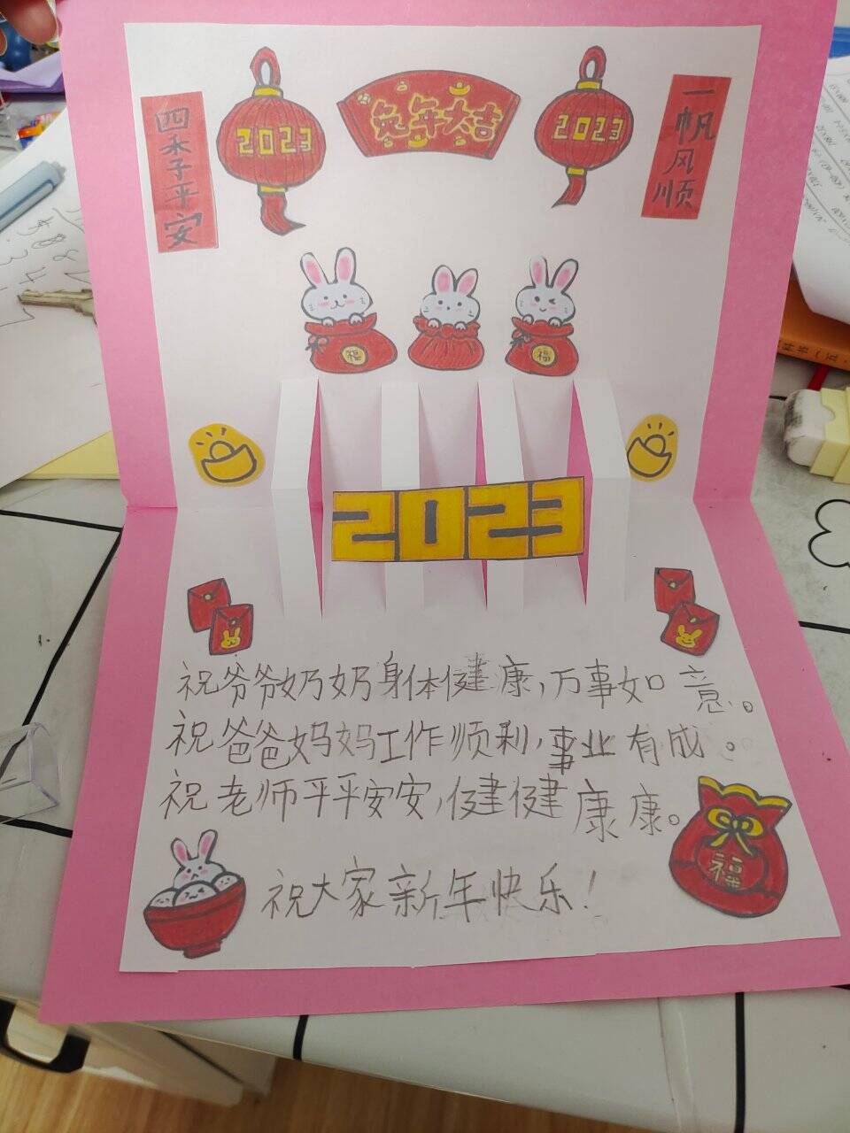 小小贺卡辞旧岁,欢声笑语迎新年。为了庆祝新年的到来,增添节日的气氛,幸福学子们怀着一颗颗感恩的心,运用新学的祝福语和自己手中的画笔,充分发挥他们的想象力和创造力,利用画、剪、贴等多种艺术手法,制作了一张张新颖独特、丰富多彩的精美新年祝福贺卡。
