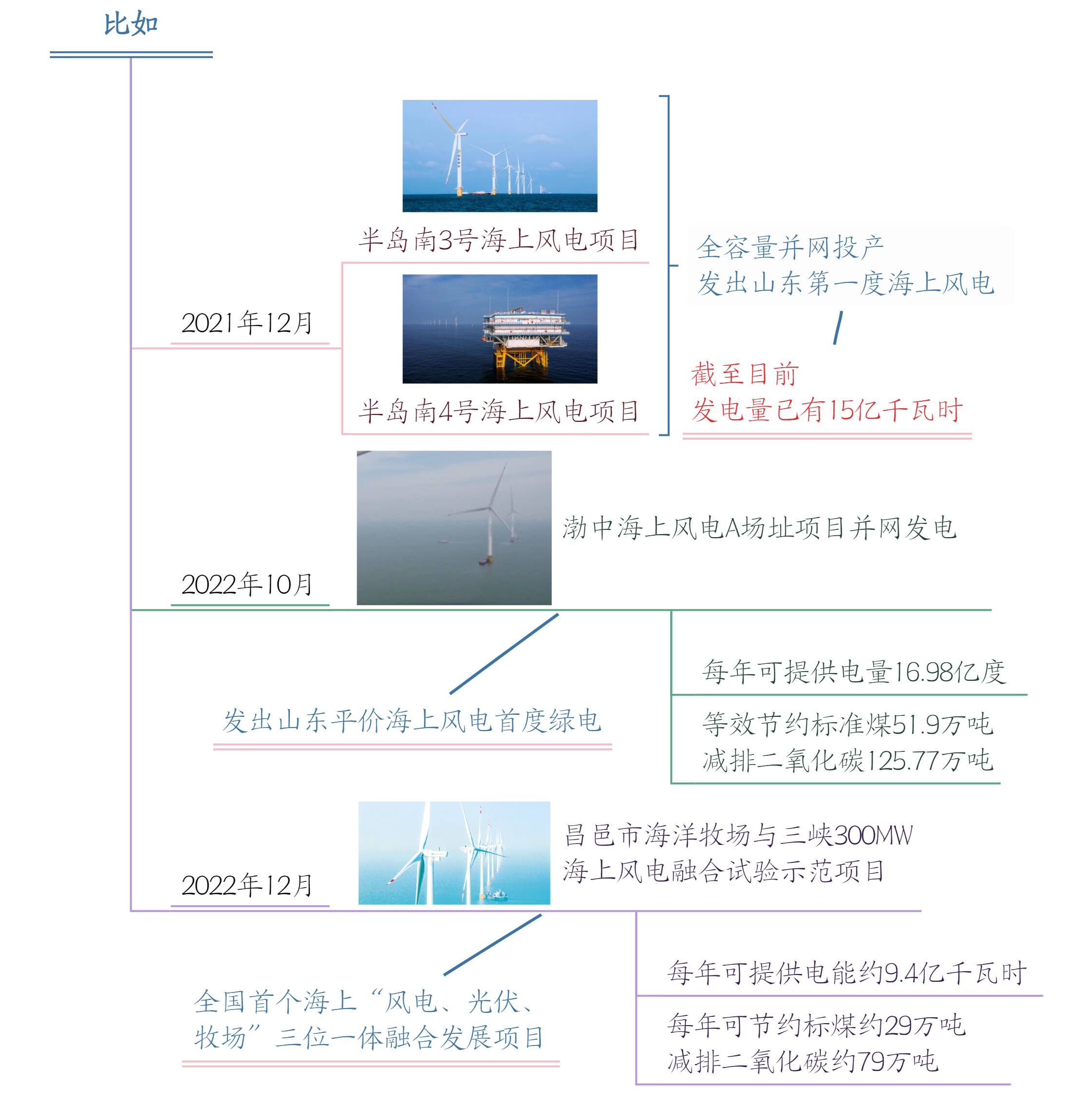 从2021年12月,半岛南3号、4号海上风电项目全容量并网投产,发出山东第一度海上风电以来,山东在渤中、半岛北、半岛南三大片区,不断推进海上风电规模化开发。