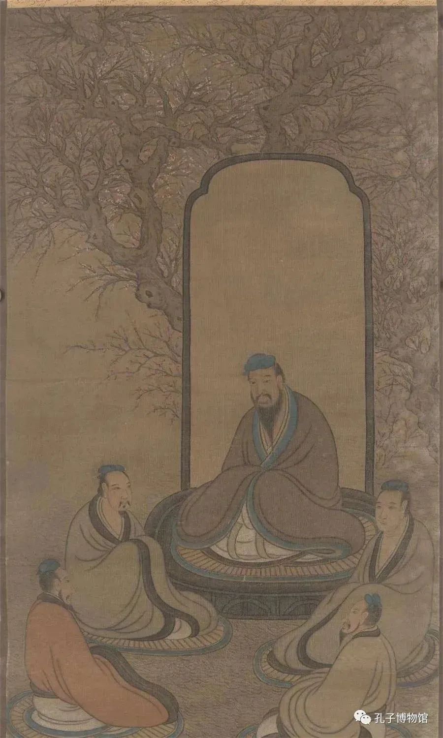 绢本设色。图绘孔子于杏坛讲学,四弟子端坐受教。背置屏风,后有杏树,老树新枝,千花万蕊。孔子神态端庄祥和,弟子全神贯注。所绘人物形态各异,面部刻画生动传神。屏风既突显了孔子的主体地位,又起到了恰到好处的留白作用,与背后刻画繁复的杏树形成鲜明对比,延伸了画面的深度。