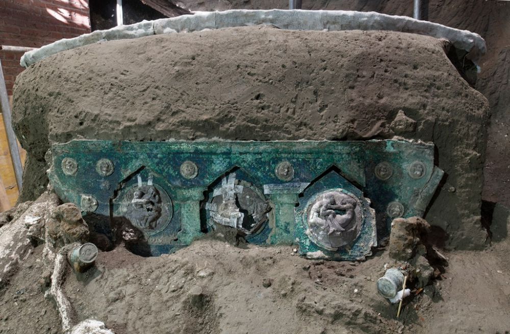 这是2021年1月27日在意大利庞贝古城拍摄的出土的四轮马车局部装饰。新华社发