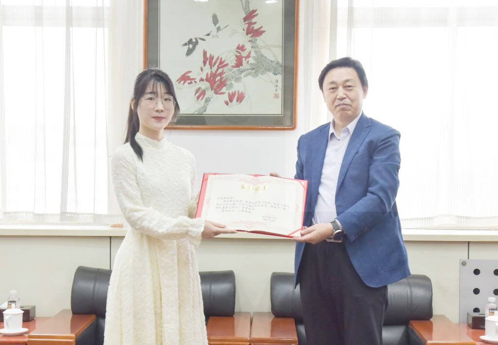 党委副书记、校长张洪海为李淑雅颁发“热心助人最美大学生”荣誉证书