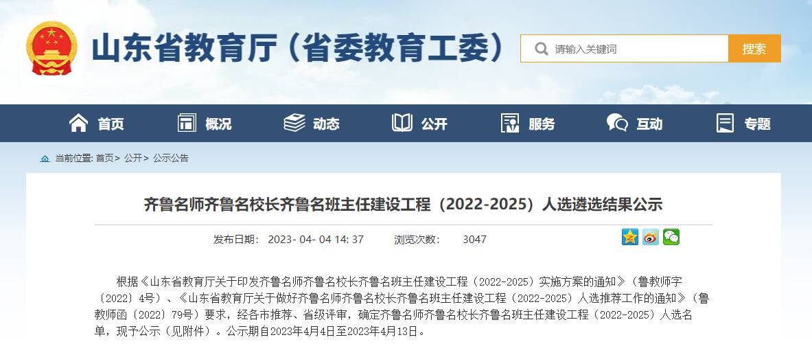 齐鲁网·闪电新闻4月5日讯 根据《山东省教育厅关于印发齐鲁名师齐鲁名校长齐鲁名班主任建设工程(2022-2025)实施方案的通知》(鲁教师字〔2022〕4号)、《山东省教育厅关于做好齐鲁名师齐鲁名校长齐鲁名班主任建设工程(2022-2025)人选推荐工作的通知》(鲁教师函〔2022〕79号)要求,经各市推荐、省级评审,确定齐鲁名师齐鲁名校长齐鲁名班主任建设工程(2022-2025)人选名单。其中平原3人上榜。