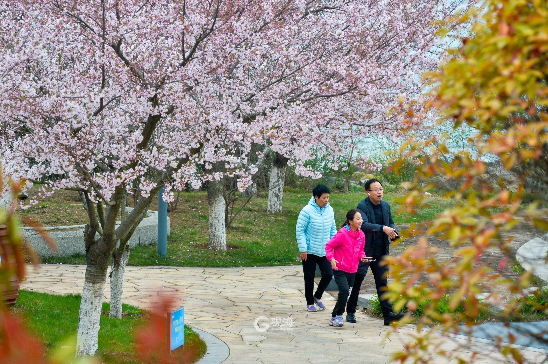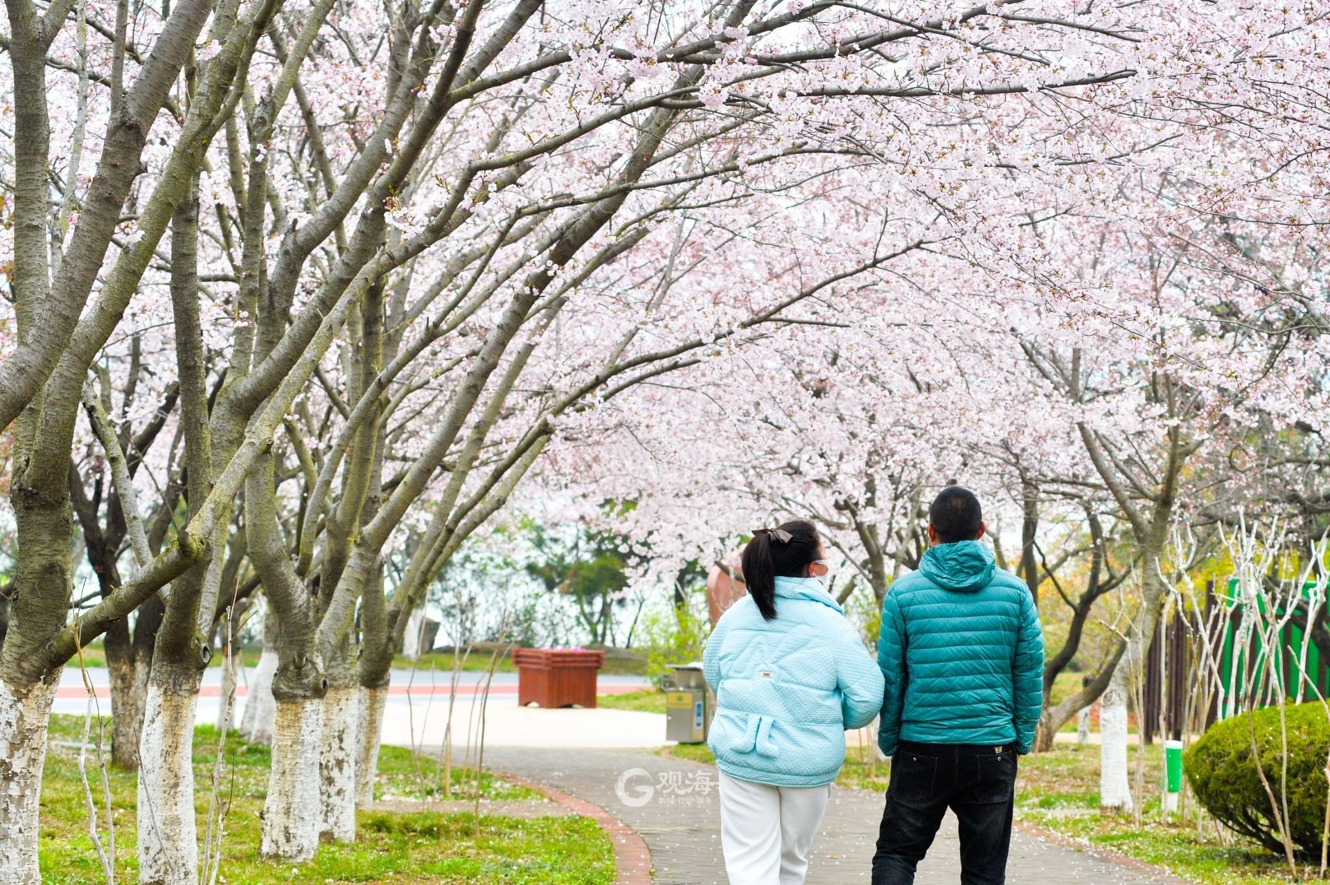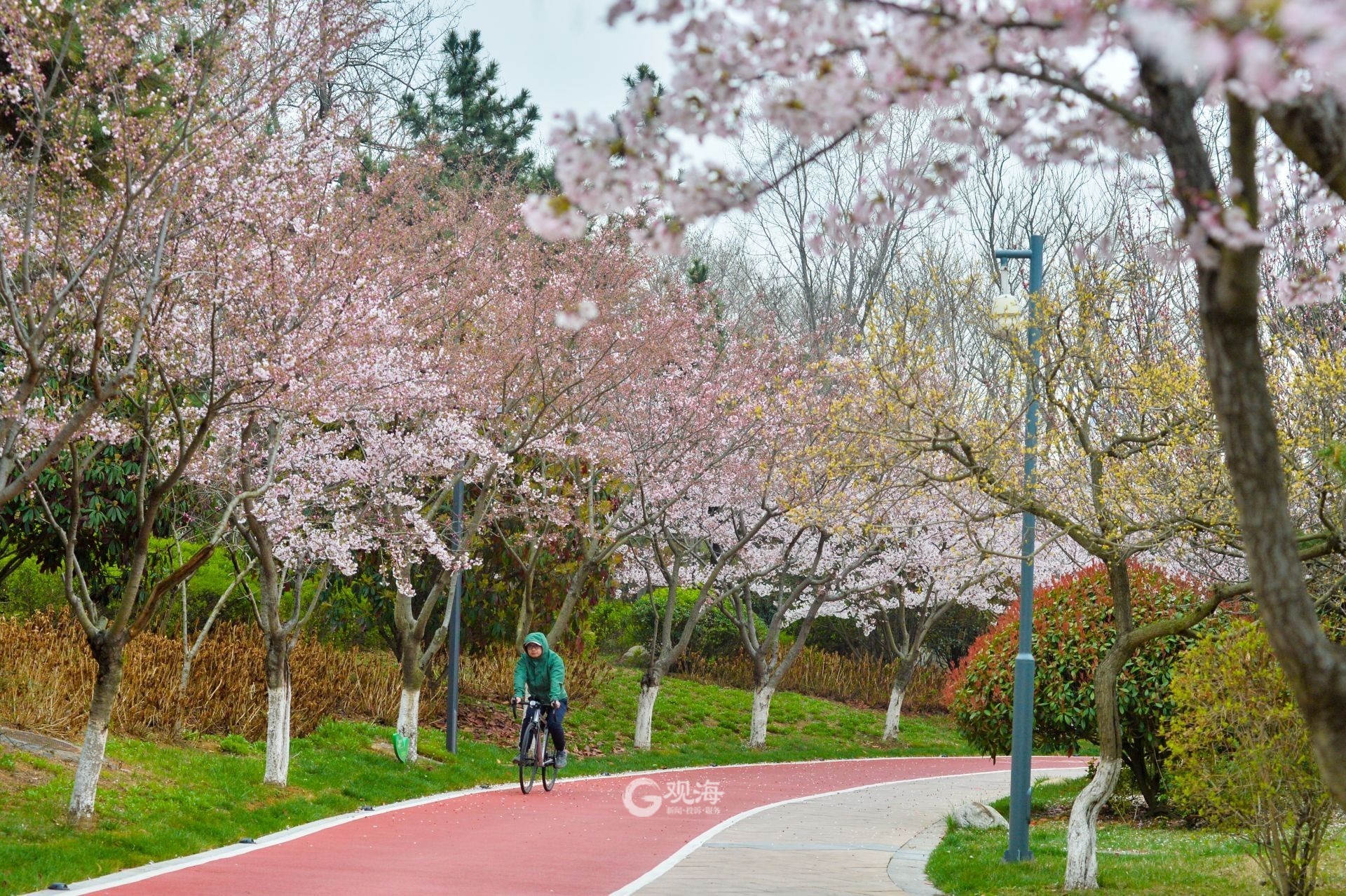 唐岛湾湿地公园南岸的樱花正值盛花期。