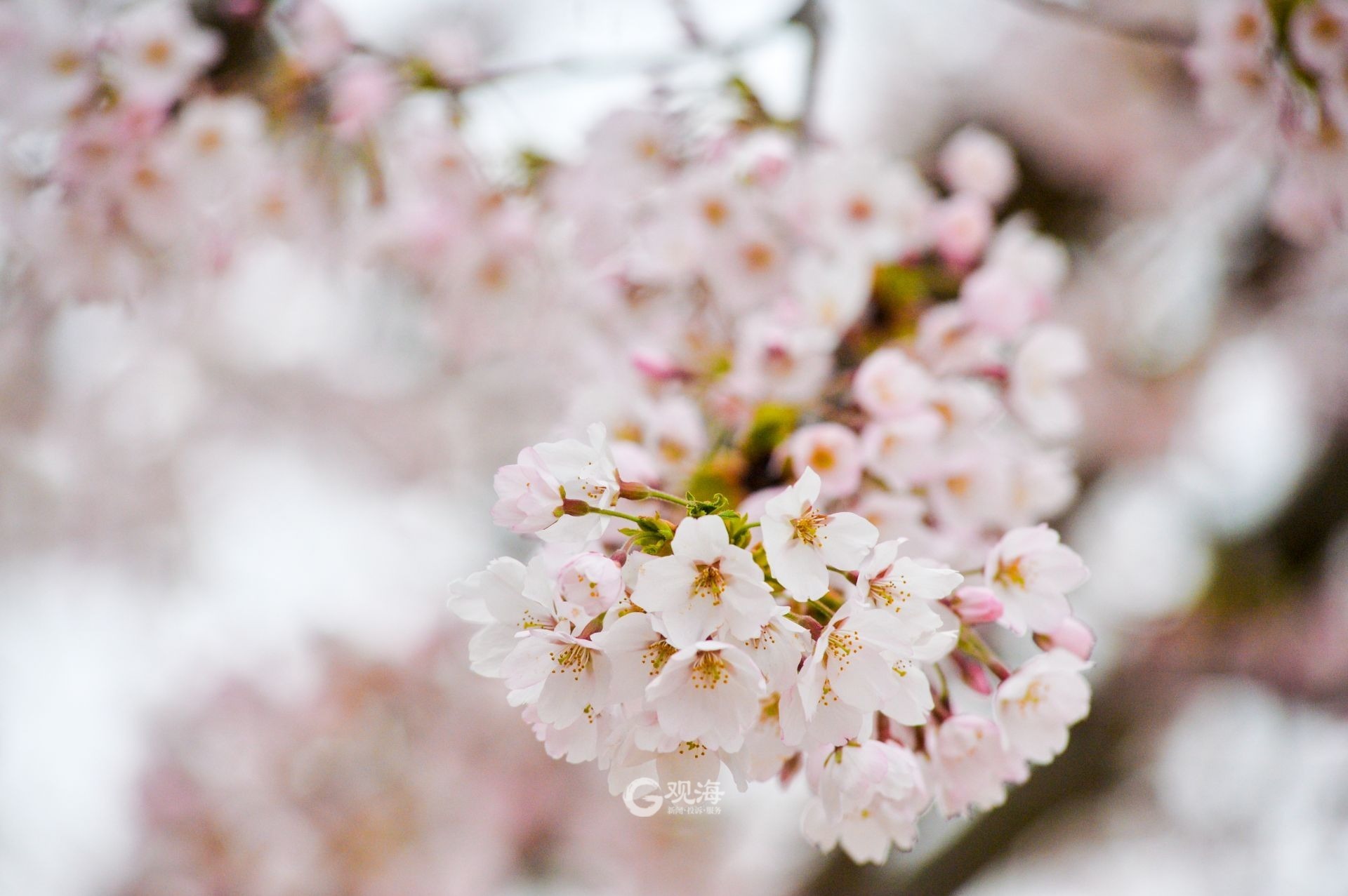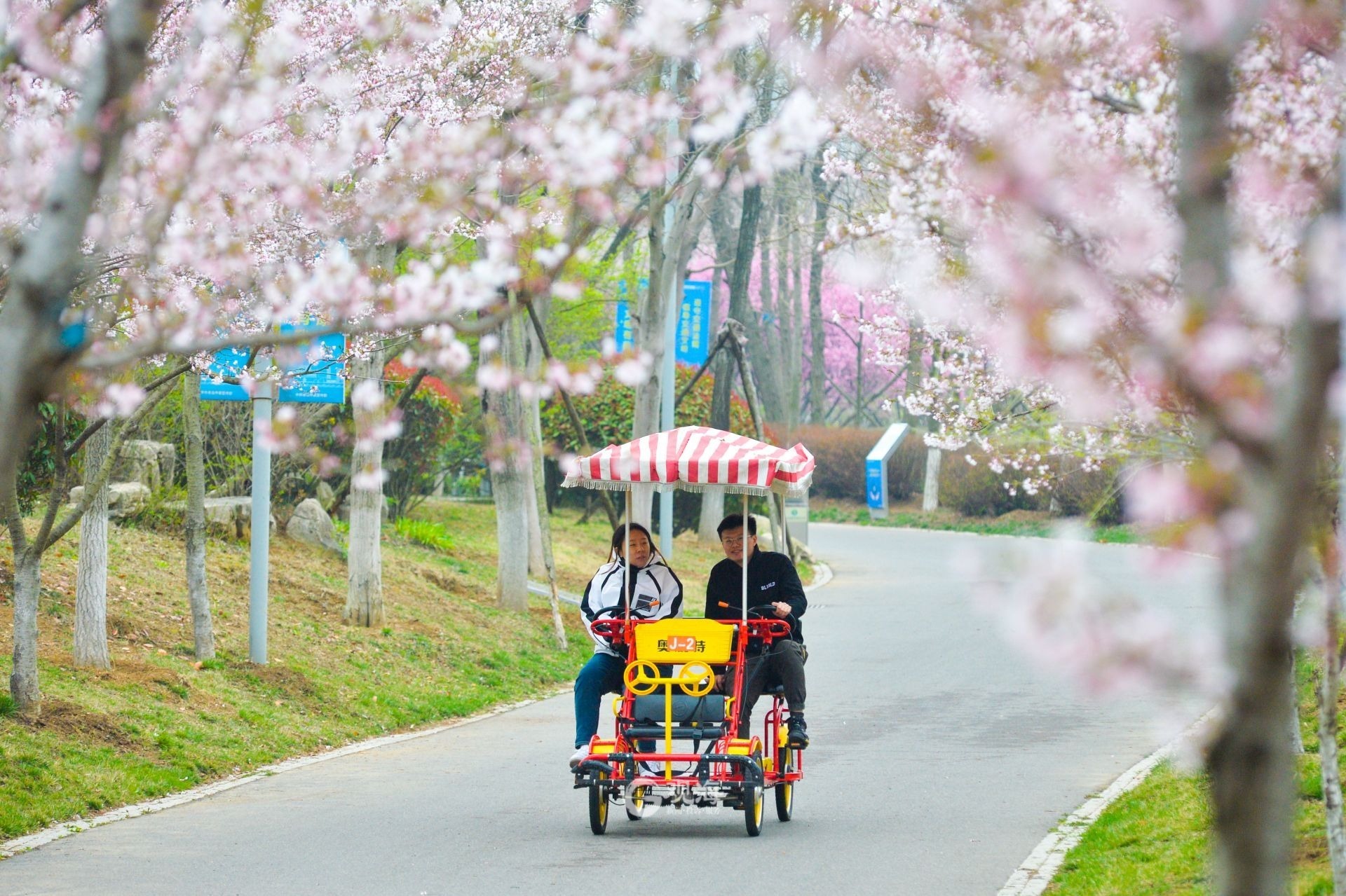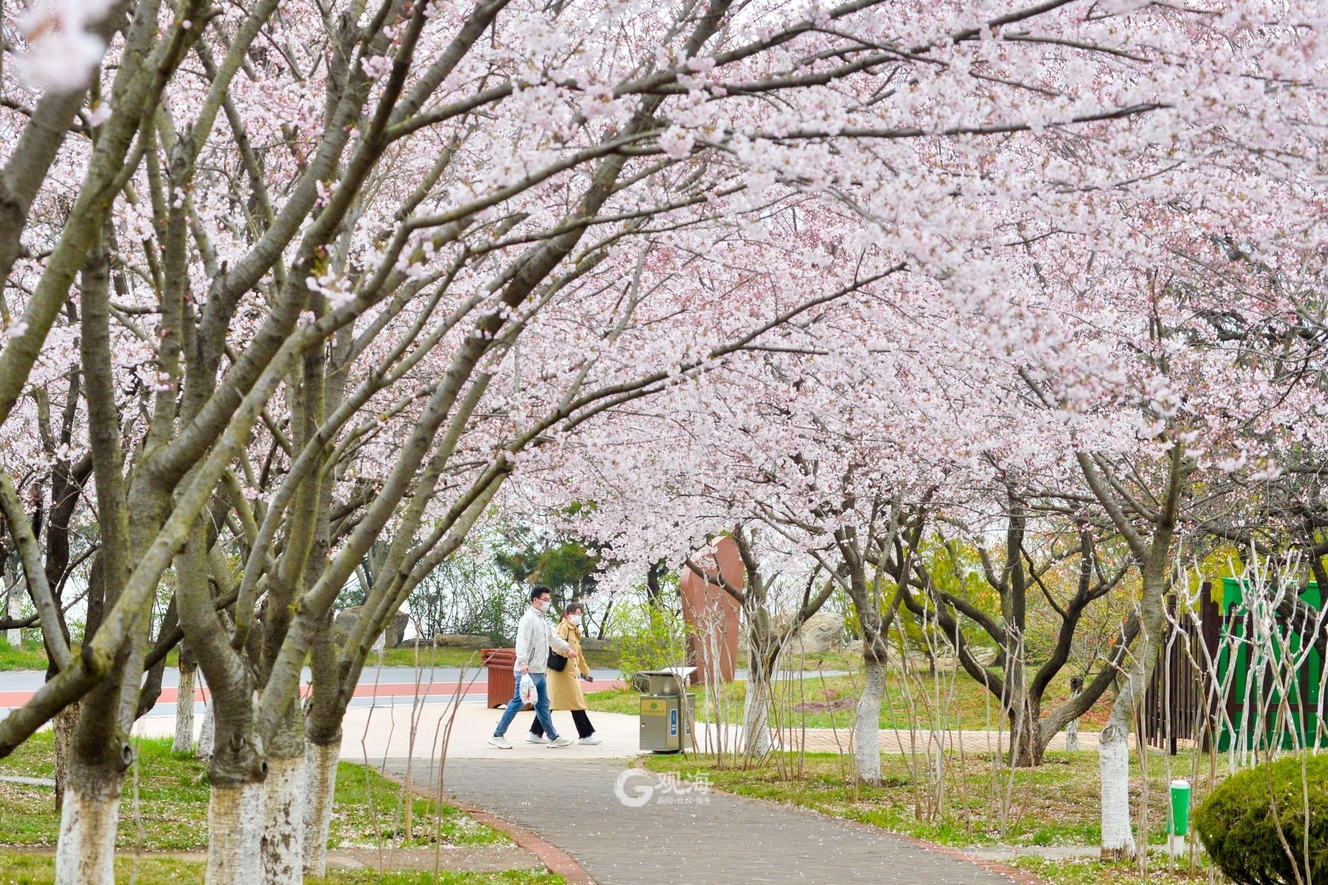 唐岛湾湿地公园南岸的樱花正值盛花期。