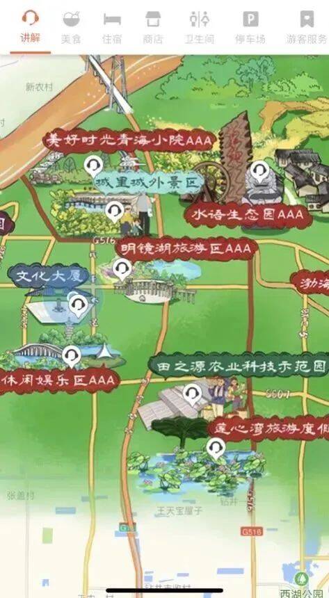 点击地图上每个景点旁的“耳机”按钮,就会弹出每个景点的名片。点击名片上的“详情”按钮,就能获取景点的详细介绍。点击名片上的“去这里”按钮,就可以获取去景点的交通方式;界面手绘地图中的按钮,可激活窗口,手动触发专业播音员配音,手动触发语音讲解,通过点击实现景区导览点内容展现,在每个景点图文详情介绍及导航。