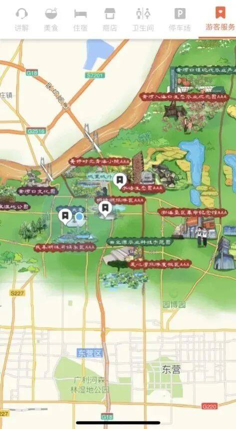地图内容上,采用中文语音讲解和景区详情介绍,涵盖了垦利区范围内的景点分布、重点文物点、住宿、购物、游客服务中心、停车场、旅游厕所等公共设施、旅游线路等,并有腾讯地图和高德地图为您导航,垦利区全域旅游资源在此图上一目了然。
