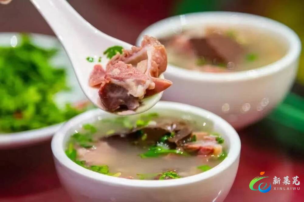 莱芜羊汤——选用莱芜山区散养的黑山羊,全羊煮制而成。汤清肉嫩,不肥不腻,不腥不膻,味道鲜美,营养丰富,是闻名省内外的特色名吃。