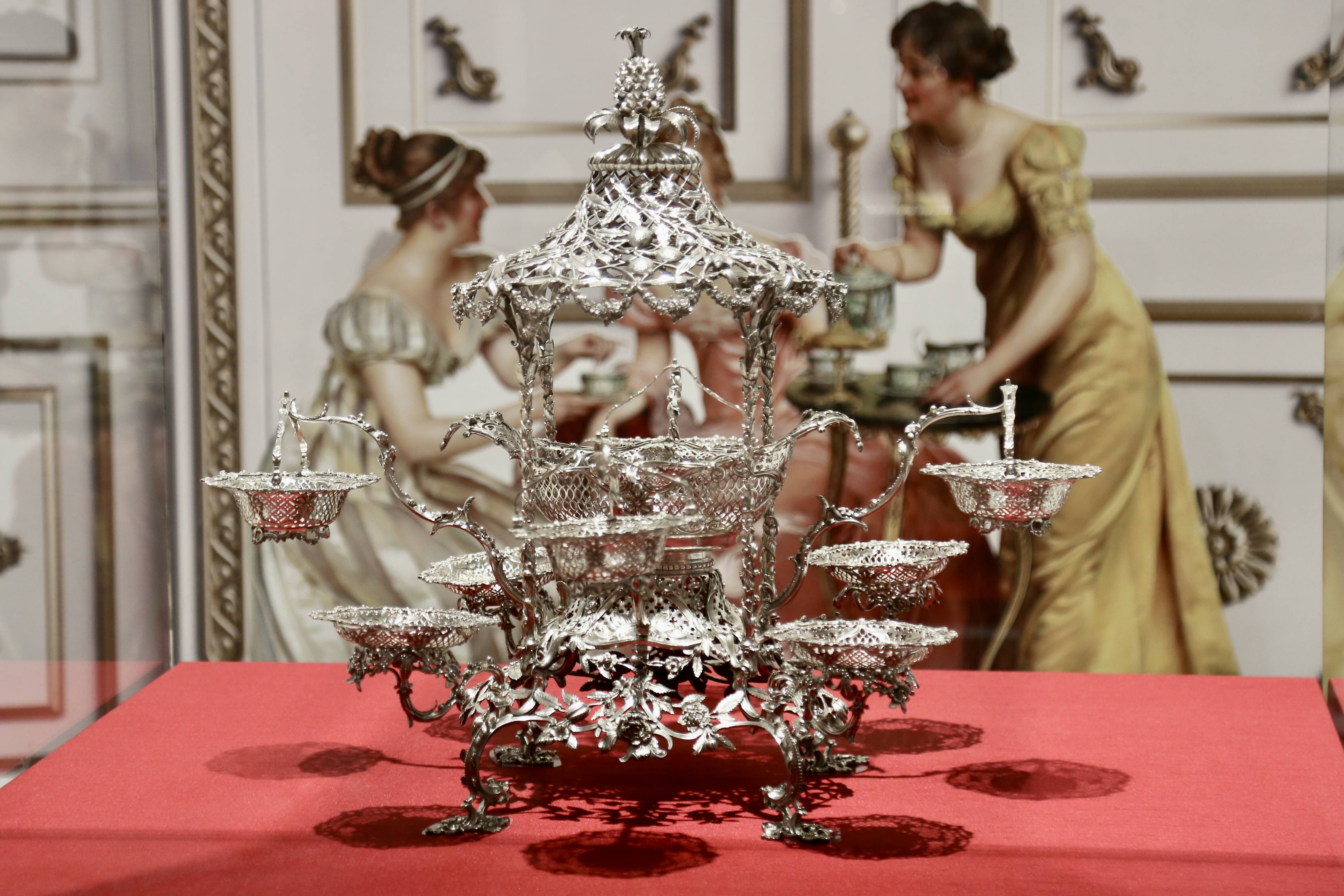 展览展出的一件银质多层饰盘,是英国18世纪餐桌上的一件典型装饰品。整件器物以洛可可式样的缠枝花卉及贝壳交织组合,呈中国宝塔的形状。而器物顶部则以菠萝装饰,象征了财富。器身上大的托盘用于盛放水果和糖果,小的托盘则用作烛台。