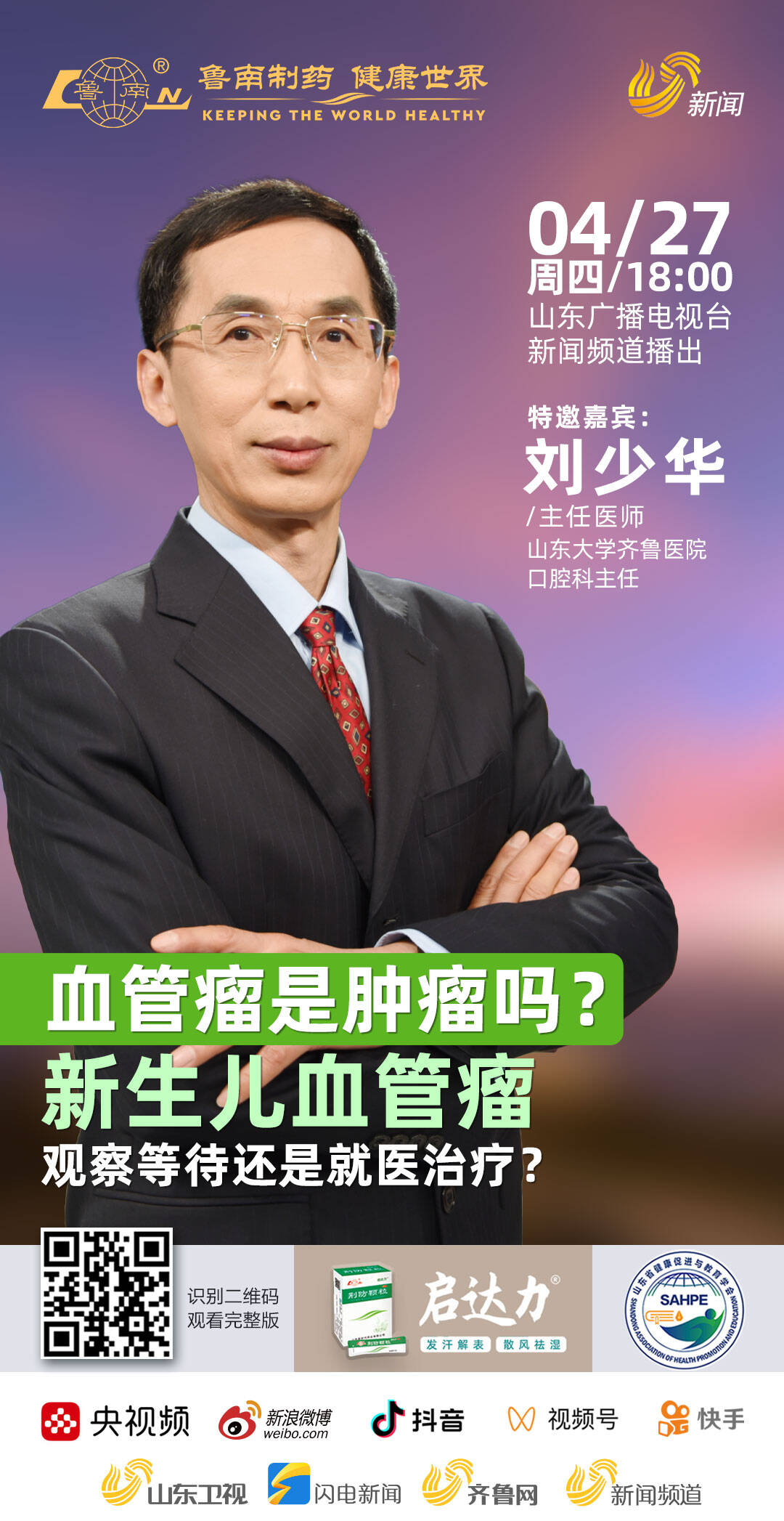 那么如何辨别血管瘤?不幸患上血管瘤该如何治疗呢?4月27日晚6:00,关注山东广播电视台新闻频道《健康山东》,山东大学齐鲁医院口腔科主任刘少华为我们解疑答惑。