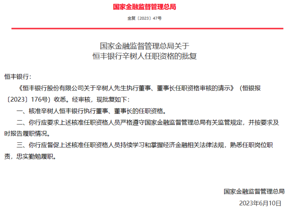 6月12日,国家金融监督管理总局官网信息显示,辛树人恒丰银行执行董事、董事长的任职资格正式获批。