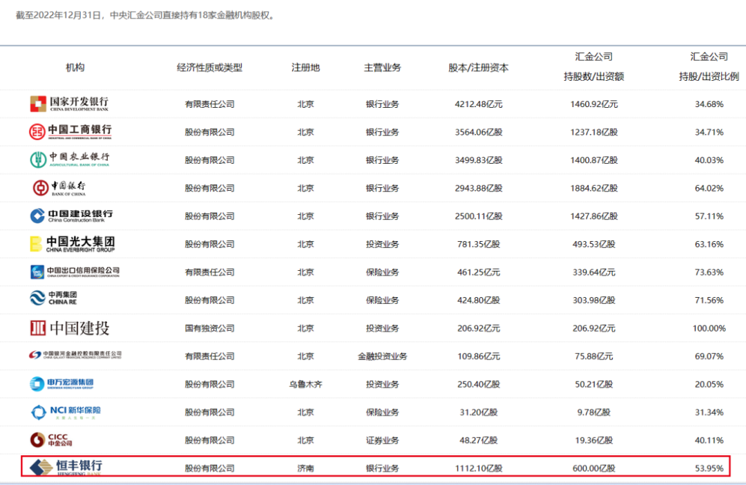 据官网介绍,恒丰银行是12家全国性股份制商业银行之一,前身为1987年成立的烟台住房储蓄银行。2003年,经中国人民银行批准,改制为恒丰银行股份有限公司。2019年恒丰银行完成市场化改革股改建账,中央汇金公司成为第一大股东。截至2022年底,中央汇金直接持有汇丰银行53.95%股权。