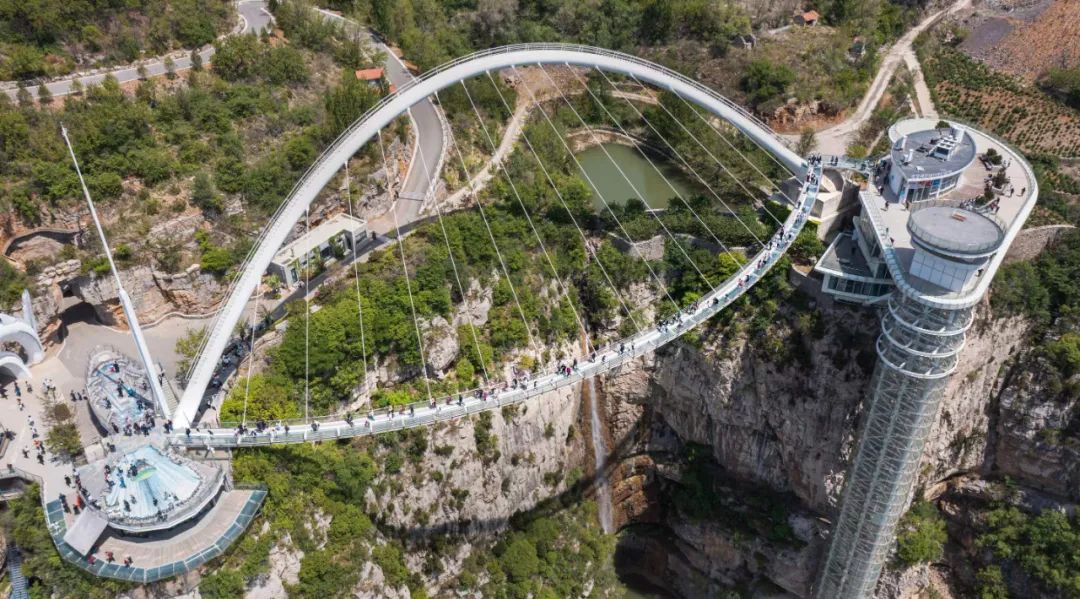 在世界首例无背索斜拉弧形玻璃桥上,一览山河远阔。