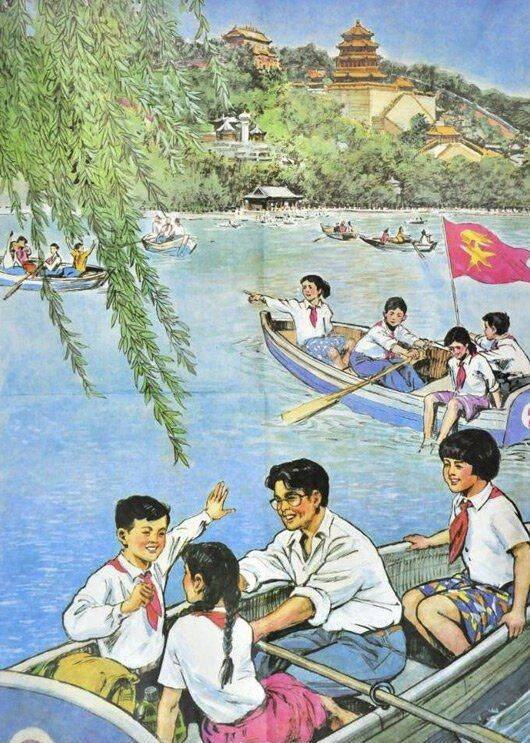 “让我们荡起双桨,小船儿推开波浪,海面倒映着美丽的白塔,四周环绕着绿树红墙……”