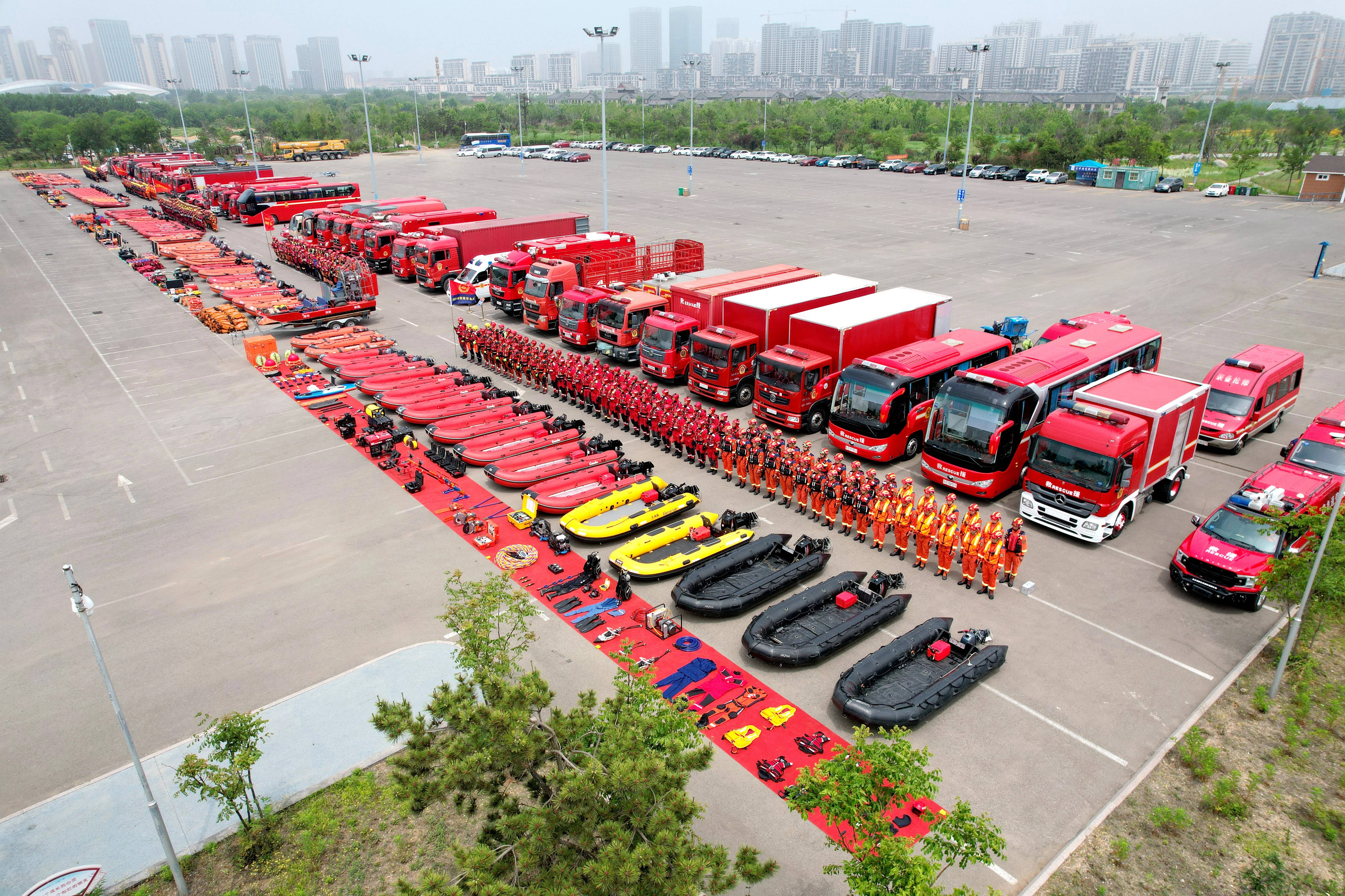 演练模拟山东地区因台风导致强降雨造成多地受灾,引发风暴潮、洪涝灾害,大量群众被困,城市民生单位被淹,部分村庄形成“孤岛”。总队指挥中心接报后,立即启动《全省消防救援队伍防汛抗旱跨区域应急救援预案》,调集2个重型水域救援专业队,14个中型水域救援专业队,160个作战单元、96辆消防车、1000余名消防指战员、3万件套装备参加。