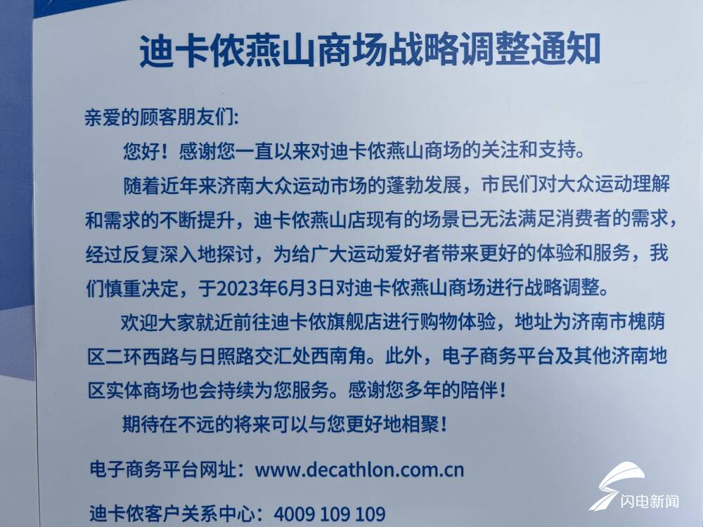 闭店通知上解释说,迪卡侬燕山商场现有的场景已无法满足消费者的需求,为给广大运动爱好者带来更好的体验和服务,决定于2023年6月3日进行战略调整。