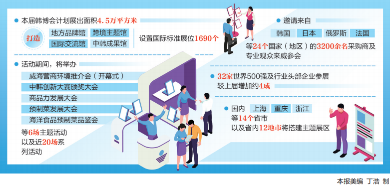 据介绍,本届韩博会计划展出面积4.5万平方米,设置国际标准展位1690个。活动期间,将同步举办威海营商环境推介会(开幕式)、中韩创新大赛颁奖大会、商品力发展大会、预制菜发展大会、海洋食品预制菜品鉴会等6场主题活动,以及采购对接会、跨境电商选品会、新品发布会、网红直播带货及嘉年华等近20场系列活动。