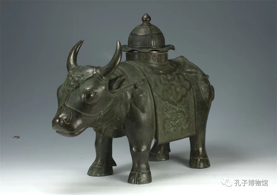 铜牺尊造型为站立的牛,牛身体敦实雄健,双目炯炯,注视前方,两耳直立,似在倾听,两尖角威挺有力,四足粗壮结实,长长的牛尾自然侧摆。牺尊腹部中空,脊背上铸有一圆形直口,铸篆文“汉元和二年造孔子庙祭器”11字,牺尊有盖,环盖一周雕有四只凤鸟、饕餮。牛背上覆褡一条长方形鞍垫,雕饰以如意纹、回纹、龟纹,左右两侧各雕刻一五爪云龙,周围饰为江水海崖、宝珠。牛首络头以宝花、璎珞相连接,额上方当卢为龇牙怒目的兽面。整个铜牺尊铸造精湛,神态威严,形体稳重,将浓厚的文化底蕴与高超的技艺完美融合于一体。