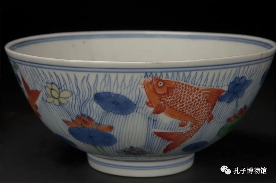 敞口,圆唇,深腹下敛,圈足。内外沿、圈足均釉下饰青花弦纹两周,内壁素白,碗中心双弦纹框内饰荷花、荷叶及波浪纹,外壁满饰水藻、花卉、鱼纹。全器纹饰布局平稳协调,是康熙斗彩中的精品。