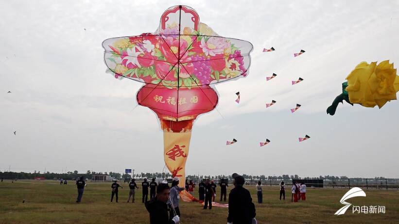 其中,一只巨大的花篮风筝格外醒目,展示出潍坊风筝的独特技艺。潍坊风筝非遗传承人郭洪利介绍说:“这只风筝主体高8米、宽7米,面积达到60多平方米。我们把它做成了最有特色的硬翅风筝。花篮中有牡丹花,寓意富贵吉祥 ,也祝福祖国繁荣富强。”