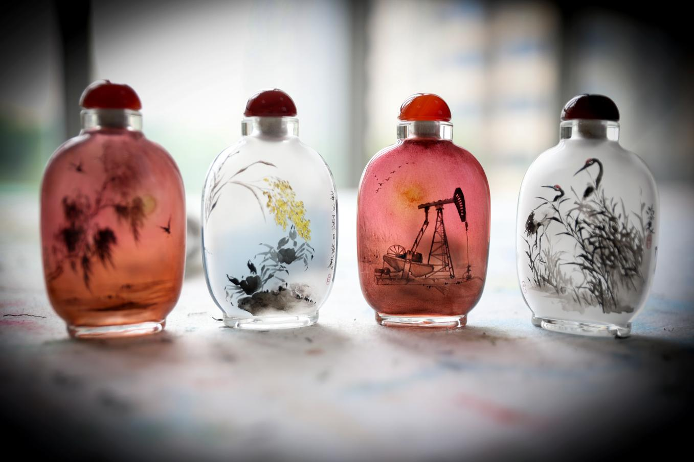 发源于清代嘉庆年间的内画鼻烟壶,历经百余年的发展传承延伸出京、冀、鲁、粤四大流派。缪荣美所传习的冀派不同之处在于其笔杆为铜线所制,可以根据需要随意弯折变化,更易在不规则的容器内壁作画。