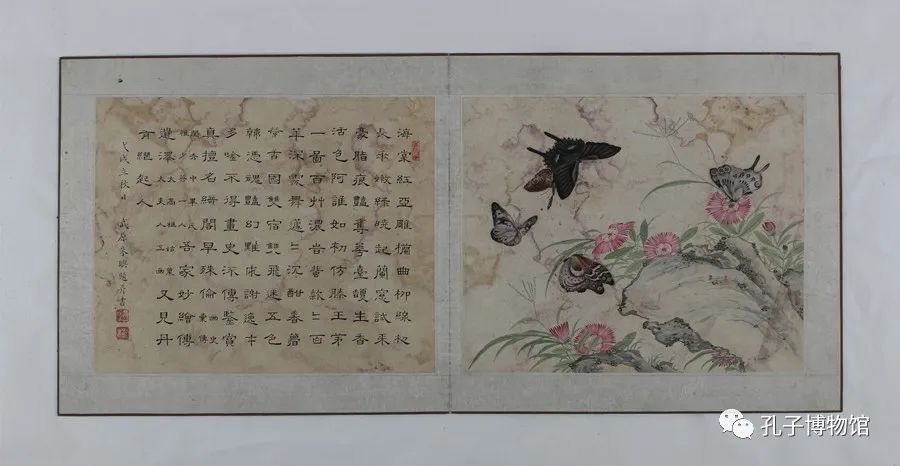 纵28.2厘米,横30.7厘米。纸本设色,工笔重彩。“蝴蝶式”绫裱,绫裱一册十六页。画为两开,一页绘画,一页为诗词并印章。这是孔繁灏夫人毕景桓所创作。