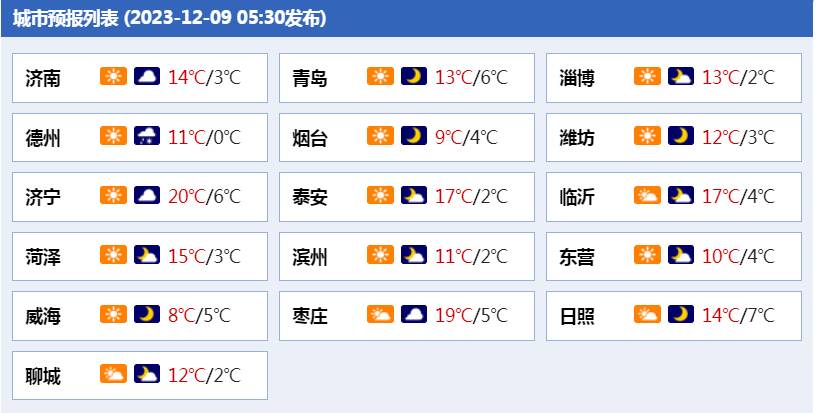 >>>9日白天到夜间,聊城和菏泽天气多云转阴局部有小雨,其他地区天气晴转多云。东北风,滨州、东营、潍坊、内陆湖面和半岛地区5~6级阵风7~8级,其他地区4~5级阵风6~7级。夜间最低气温:鲁南地区5℃左右,鲁中山区0℃左右,其他地区2℃左右。最高气温:泰安、菏泽、济宁、枣庄和临沂18℃左右,淄博、鲁西北和北部沿海地区10℃左右,其他地区14℃左右。