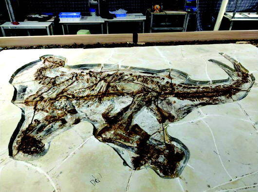 郭颖进一步解释,发掘点位于“热河生物群”范围,它的特点是容易保存皮肤羽毛化石,但大型动物化石发现较少。清理后,团队发现尾椎、前肢等完整的恐龙化石躯体。后经修复、研究确认,这具化石属于剑龙类恐龙。
