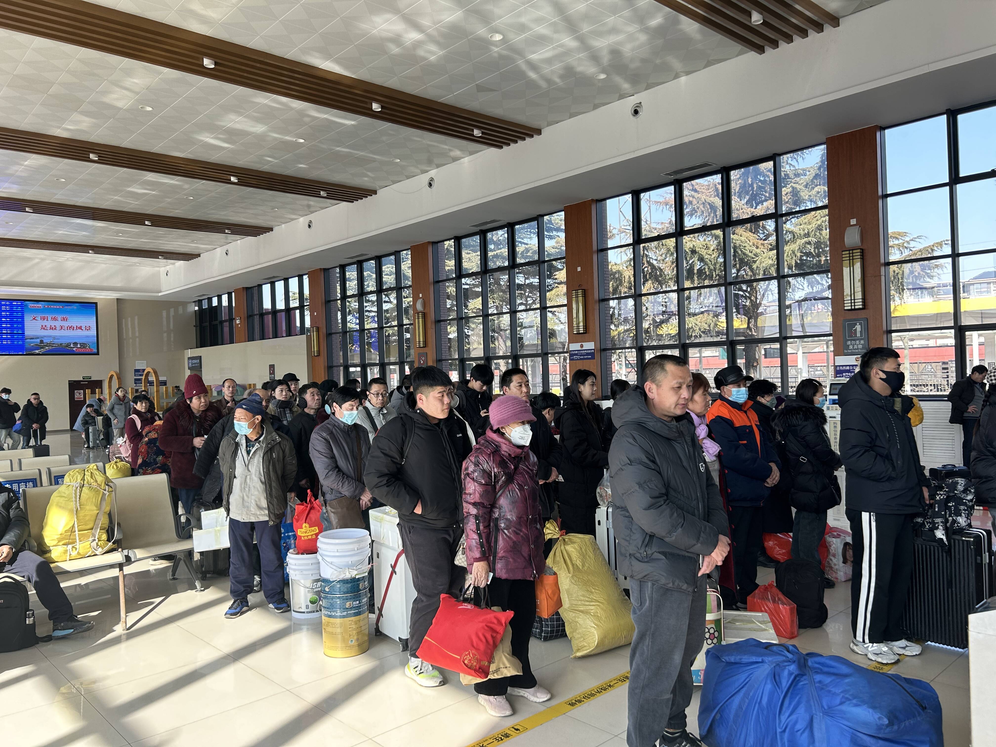 “因春运期间客流增长,我们还安排了休班人员到站进行帮班,还设立了党员先锋岗,春运期间每天安排人员到站值守,确保春运期间人手充足,更好地为大家提供服务。”青岛车务段胶州火车站客运值班员赵雅芝说。