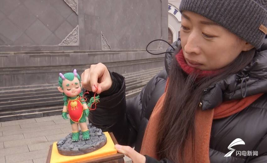 潍坊市面塑技艺代表性传承人王国红向记者展示了面塑原创作品《小龙人》,“儿时的记忆”进一步激发了她的创作灵感。她说:“今年是龙年,我比较怀念小时候那种感觉,所以就做了小龙人这样一个作品。龙角是用特殊材质的面做的,呈现出一种很通透的质感。”