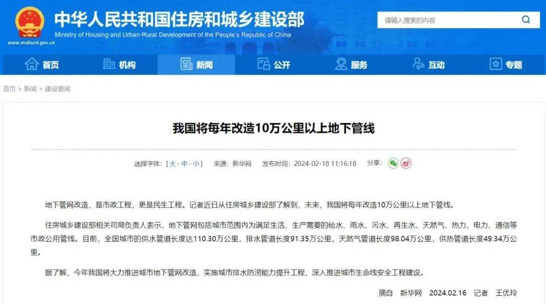 此外,2024年政府工作报告中也提出“加快完善地下管网”;住房和城乡建设部部长倪虹也提到,继续加大城镇燃气、供水、污水、供热等老旧管道改造力度,全年再改造10万公里以上。