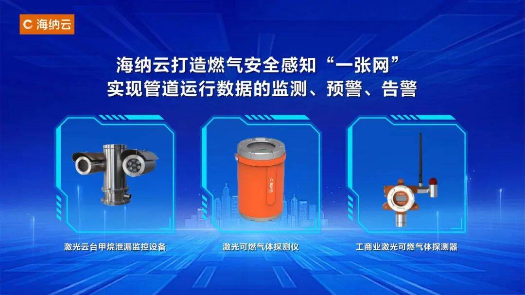 在前端感知布置上,海纳云同样以高技术含量率先示范。其自主研发“激光可燃气体探测仪”“工商业激光可燃气体探测器”等感知设备,基于TDLAS甲烷检测技术,可高灵敏监测预警燃气泄漏,成为守护燃气管道安全的“探照灯”“千里眼”。