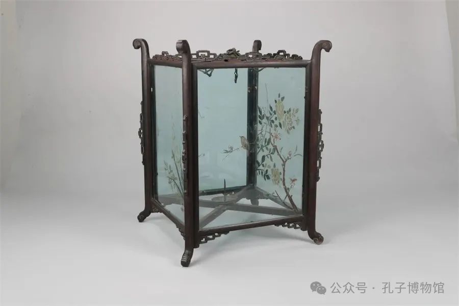 这件玻璃方灯的灯罩上绘有一只小鸟身披黄羽立于枝头。黄莺身形娇小灵动,歌声婉转动听,所以是古典诗词中常用的意象。“几处早莺争暖树,谁家新燕啄春泥。”惊蛰时节,鲜花盛开,莺歌燕舞,春色越发生动明媚了。