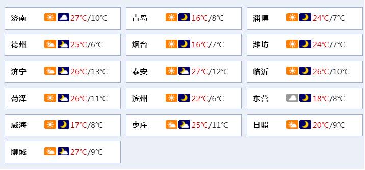 >>>8日白天到夜间,北部沿海地区天气晴转阴局部有雷雨或阵雨,其他地区天气晴间多云。鲁西北、鲁中和北部沿海地区北风4~5级阵风6~7级减弱到3~4级,其他地区南风2~3级转北风3~4级,雷雨地区雷雨时阵风7~9级。夜间最低气温:鲁南地区10℃左右,其他地区7℃左右。最高气温:沿海地区17℃左右,其他地区26℃左右。