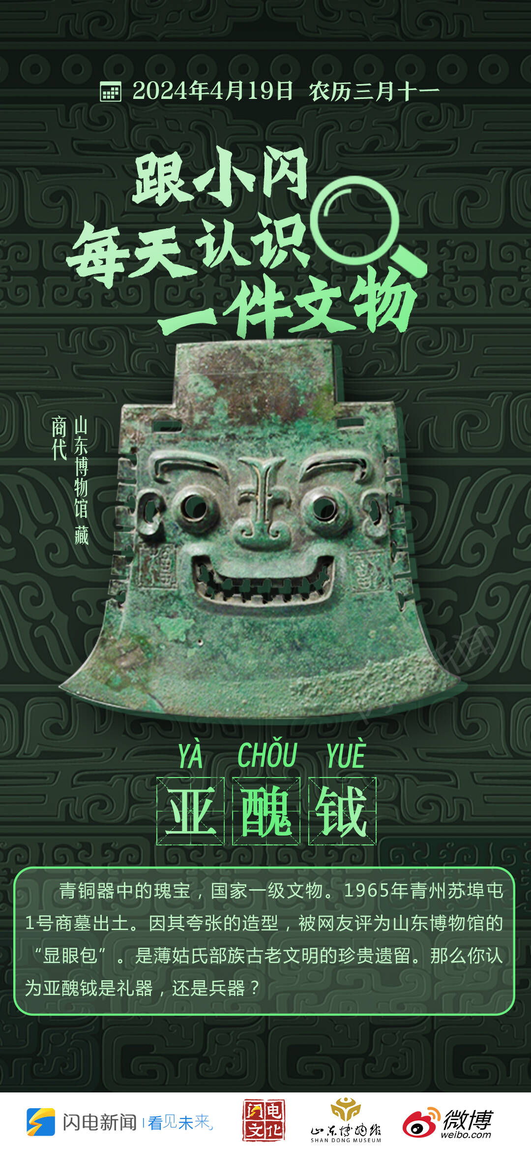 6000年前,古人是怎样生活的?2000年前西周贵族就有了碗碟套餐?以城池来衡量玉璧价值的年代,玉的制作可以有多精美?每一件文物都承载着丰富的故事和深厚的文化,看文物触摸历史的温度。即日起,闪电新闻联合山东博物馆、新浪微博推出“闪电每日文物”专栏,每天一件文物,快跟小闪一起探寻文物背后精彩的历史故事。
