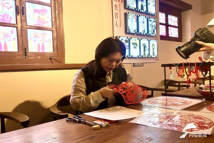 沿着青砖漫步,记者们来到烟台剪纸工坊,随处可见各式各样、颜色丰富的剪纸,国家级非物质文化遗产烟台剪纸项目代表性传承人梁巧艳正坐在屋内,精心雕琢着手中的作品。