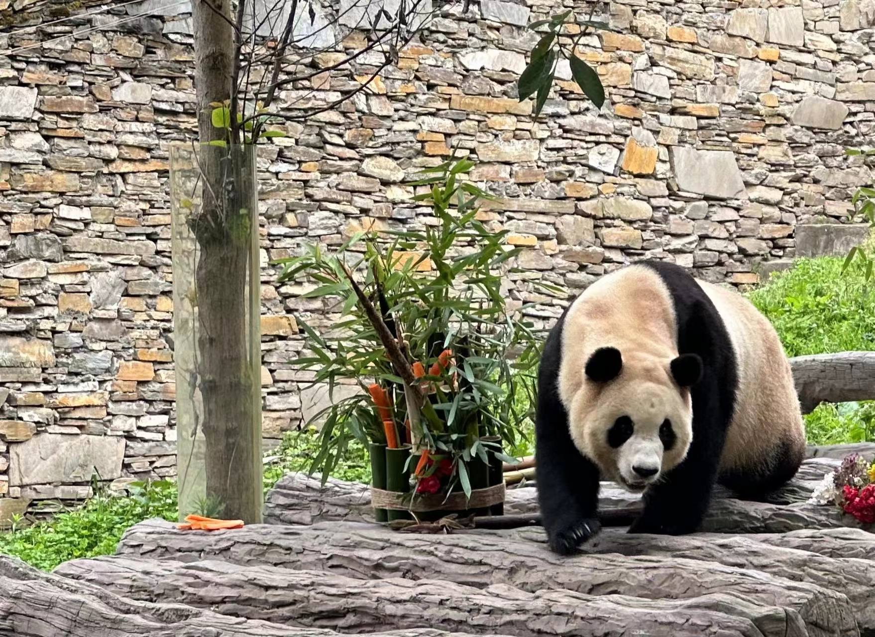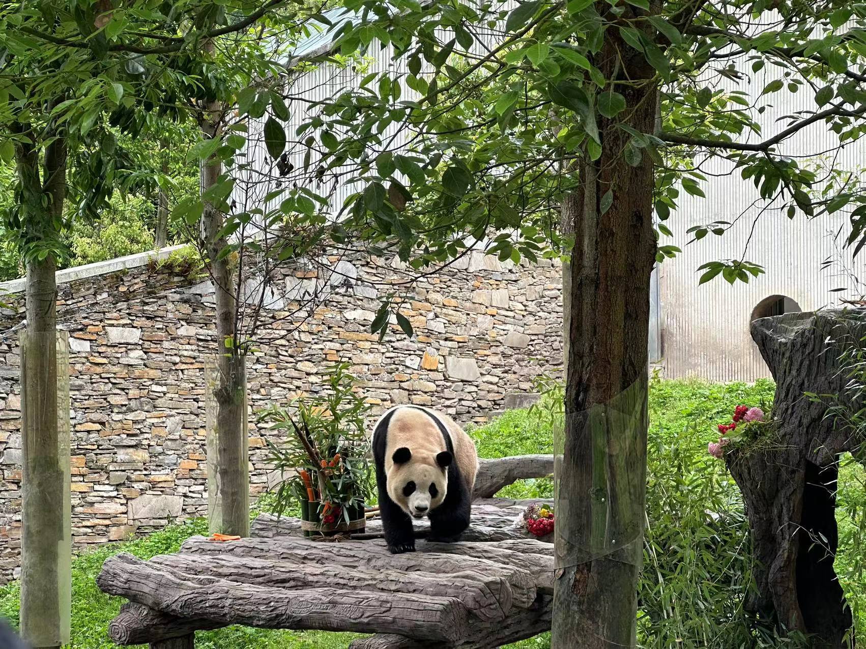 上午9:00,40余名学生粉丝和20余家中外媒体早已在“福宝”圈舍外的游客参观区域,翘首以盼“福宝”出场。当通往外运动场的小门打开后,“福宝”从内舍缓缓走出,在新家院子里好奇地四处张望、嗅闻,在探索了一圈以后,准确找到了摆放在运动场的食物,随即悠闲享受食物带来的美味。