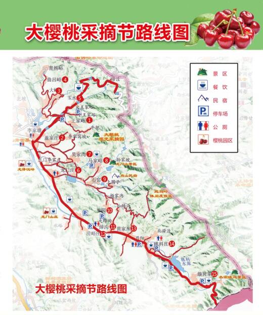 五峰万亩樱桃谷因得天独厚的自然条件,孕育的樱桃果大、色鲜、肉多、味甜、含糖量高,果品口感好,有红灯、美早、萨米托、黑珍珠、布鲁克斯、冰糖樱等二十多个品种。樱桃采摘主要分布于润玉泉、北黄、朱庄、纸坊、北西石等12个村,有20多个采摘点。采摘期为5月中旬至6月上旬。