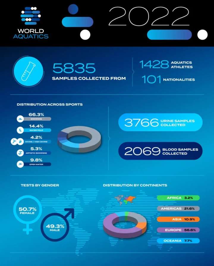 此外,2023年男子200米个人混合泳奥运冠军汪顺总共接受了22次检查,400米混合泳世界纪录保持者、法国人马尔尚是12次;男子100米仰泳世锦赛冠军徐嘉余“领走”26次检查,美国奥运冠军墨菲为12次;新科女子100米蛙泳世界冠军唐钱婷进行了21次检查,美国名将莉莉·金的数字为10次。