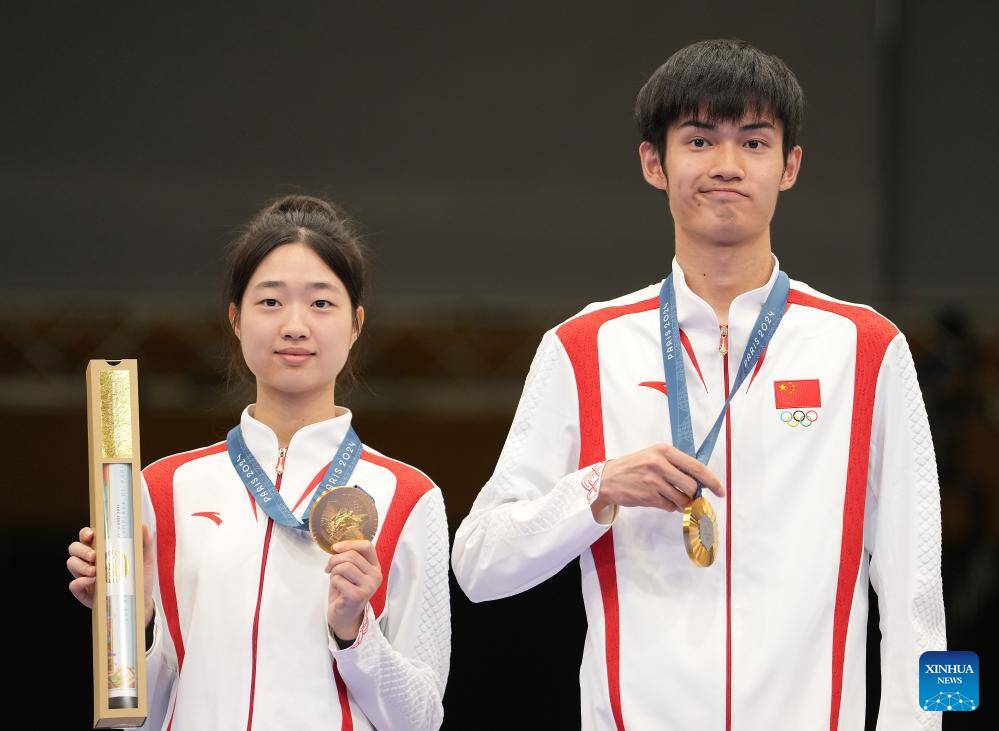 Gold medalists Huang Yuting (L)/Sheng Lihao of China pose for photos during the awarding ceremony after the 10m air rifle mixed team gold medal match of shooting at the Paris 2024 Olympic Games in Chateauroux, France, on July 27, 2024. (Xinhua/Ju Huanzong)