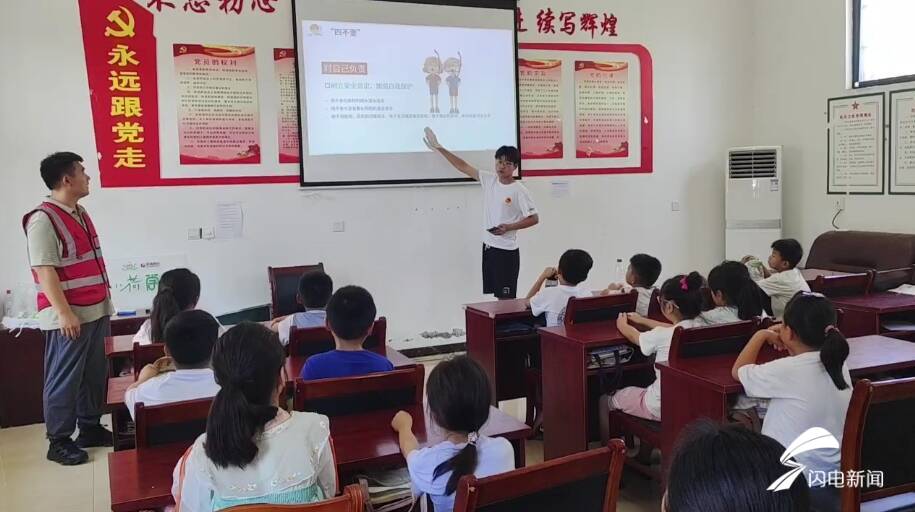 齐鲁网·闪电新闻7月29日讯 “刚才我讲的防溺水‘六不’原则都有什么?”在郓城县张鲁集镇西苑庄村新时代文明实践站的“小荷学堂”,来自青岛农业大学“荷润童心德泽未来志愿团队”的支教大学生正在讲解防溺水安全知识。