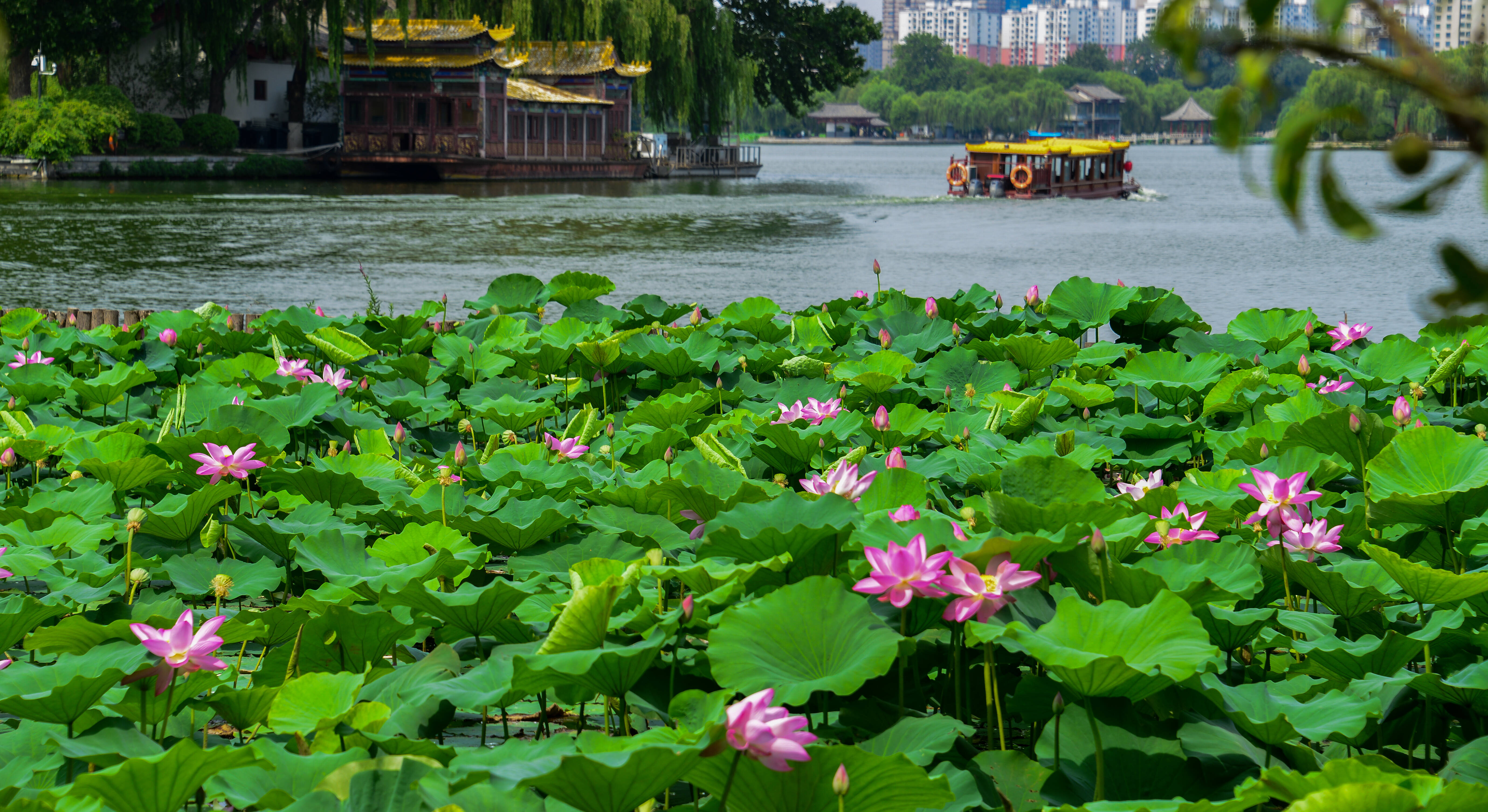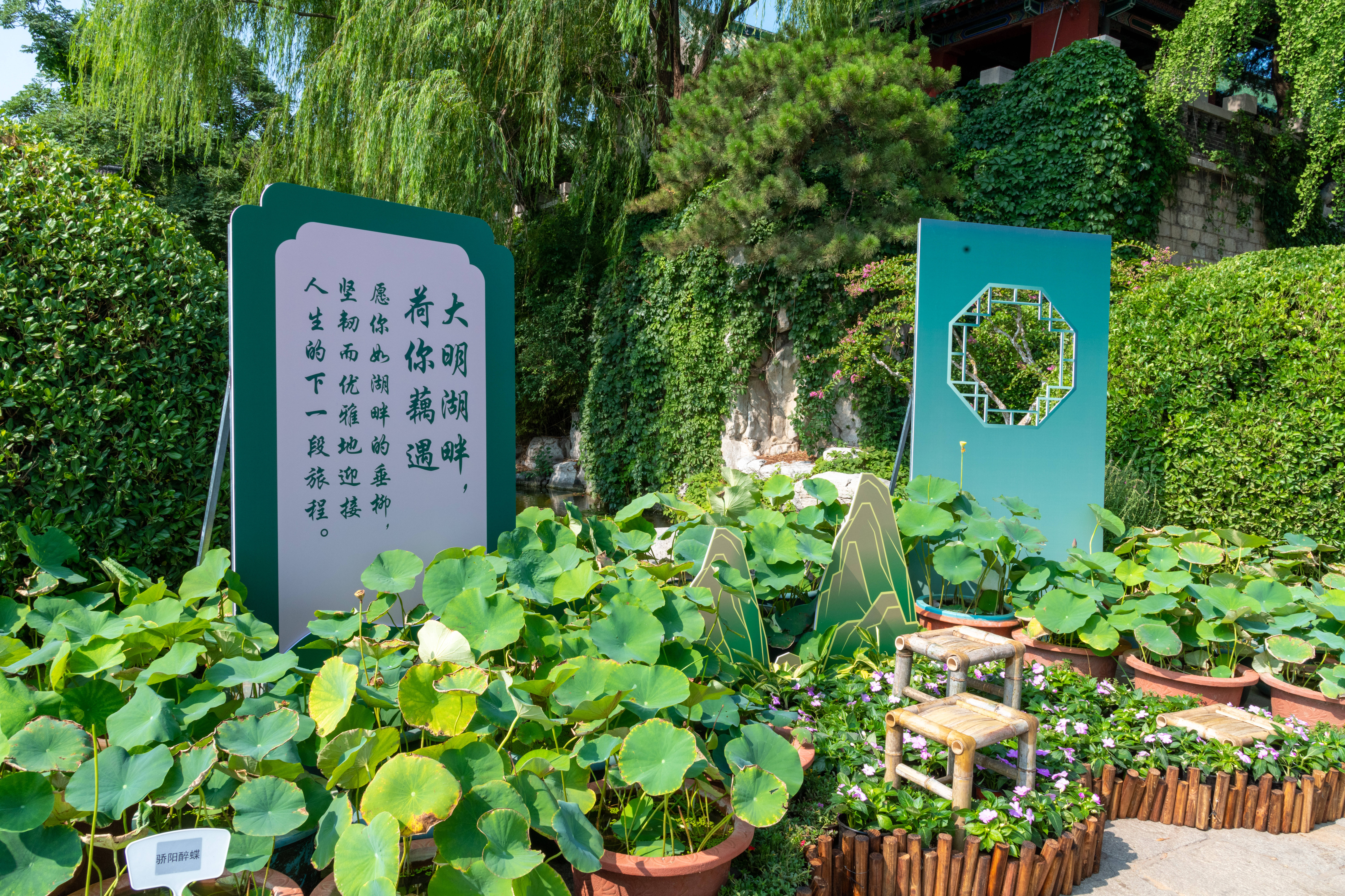 夏日赏荷自古以来便是游大明湖的雅事之一。此次展览以观赏大湖荷田内荷花为主,同时在大明湖景区内设置大、中、小型荷花小景共9组(含品种荷花),分别分布在大明湖景区东门至钢琴广场处,展出荷花800余盆、草花约8000盆,水生植物约200盆。